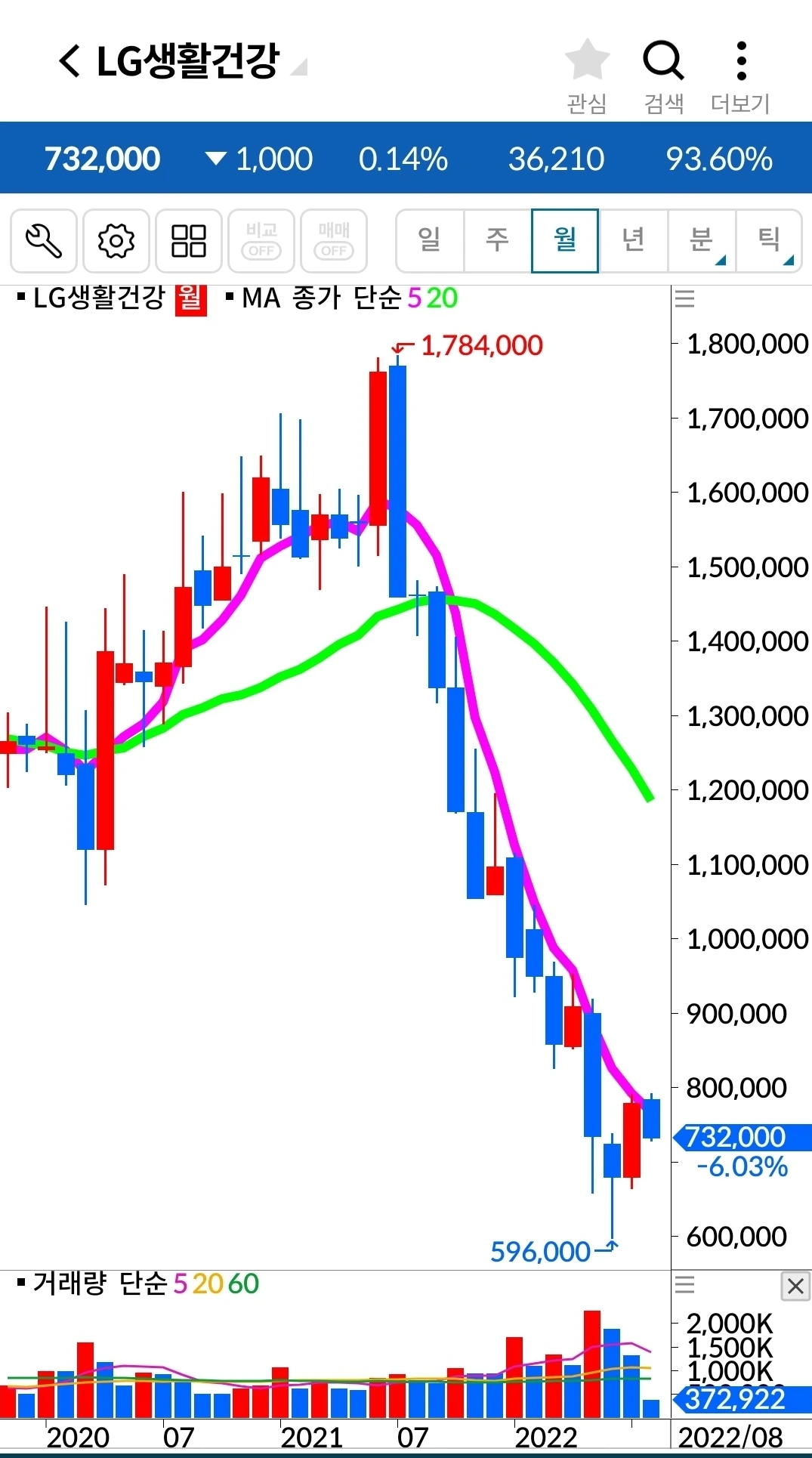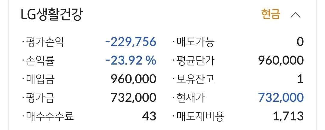 엘지생건. 22만 원 손실 중. 딱 한 주가 남았다. 몽땅 매도를 했어야 하는데 대용이 풀리지 않아 한 개가 남게 되었다. 대용을 풀어야 매도가 가능한 걸 깜빡 잊고 마지막에 허둥댔다. 그래도 한 개 남기고는 모두 탈락시켰다.