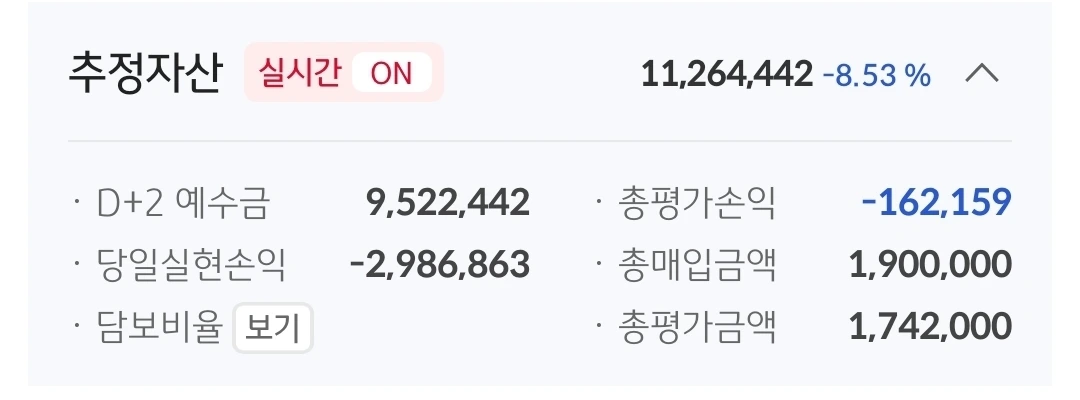 현물 계좌 총자산. 1126만 원. 874만 원 손실 중.