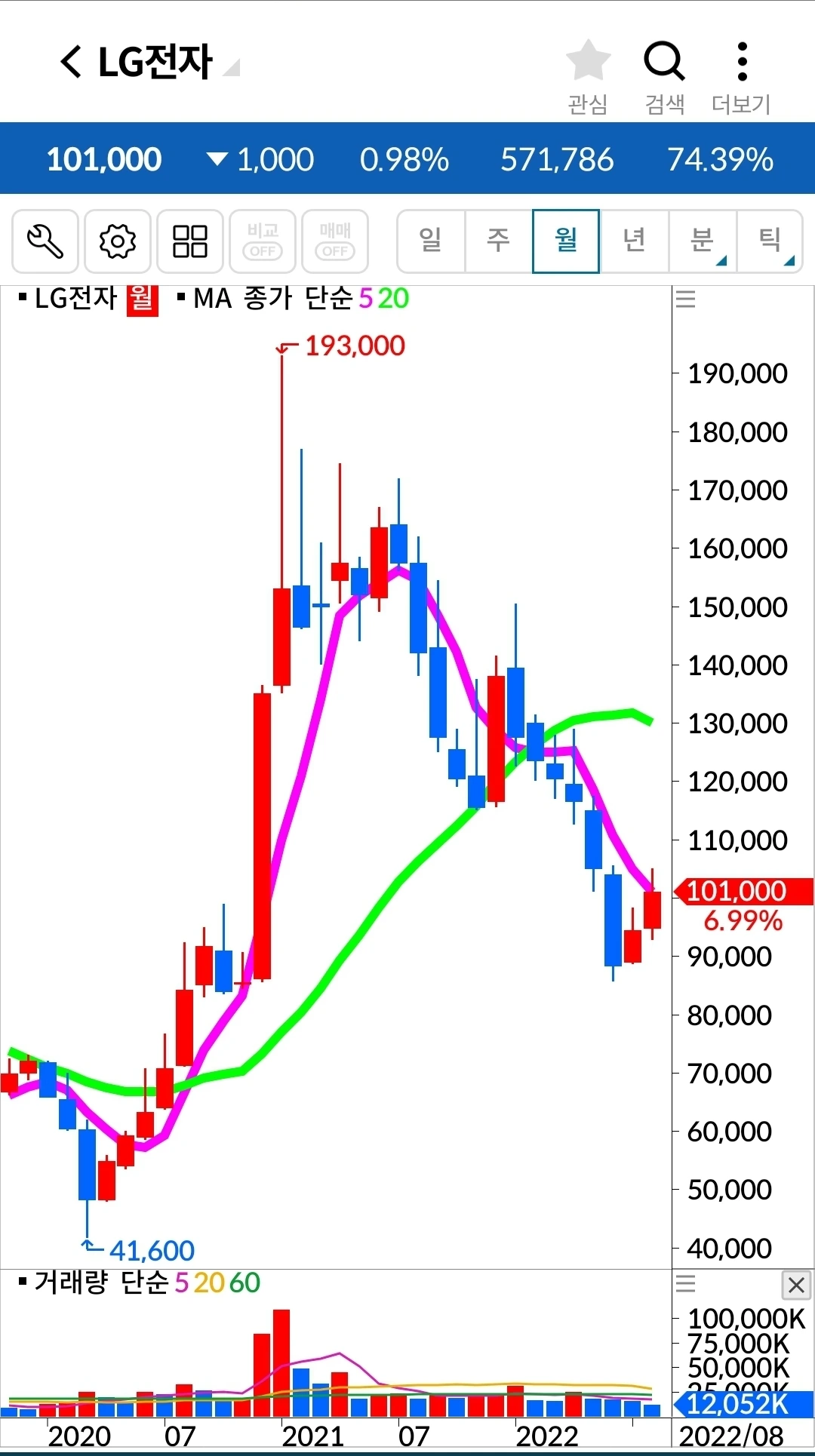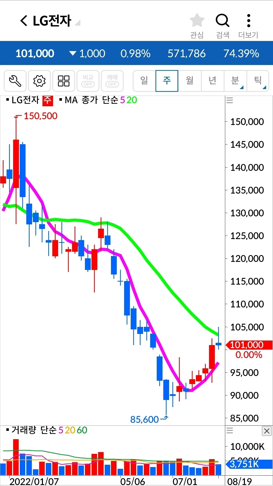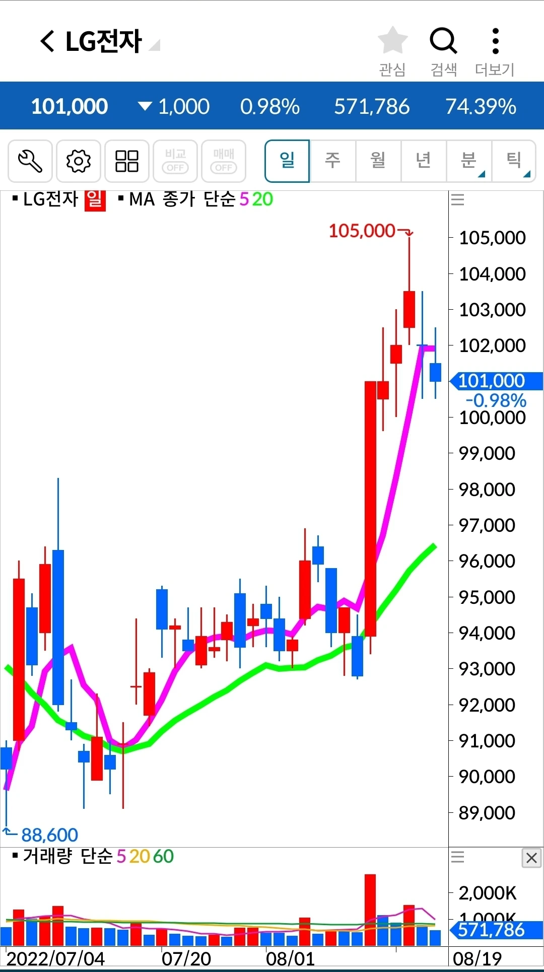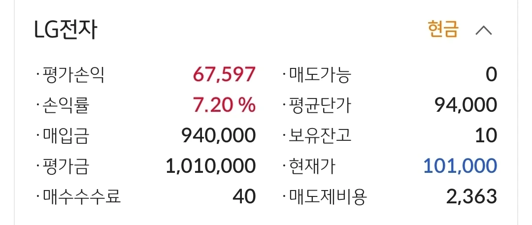 엘지전자. 6만 원 수익 중.