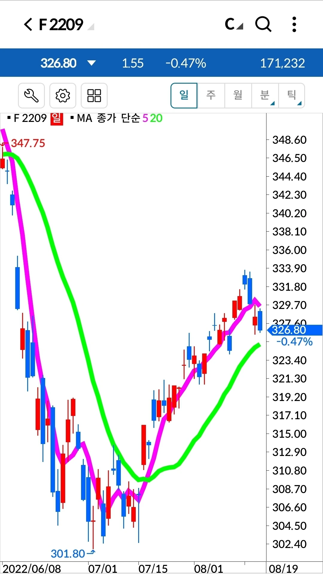 지수선물 역시 잘 올라가다가 20일 선까지의 조정을 보이고 있다. 아직은 매도하지 않아도 용서가 된다. 잘 지켜보다가 5일선이 20일선을 깨고 내려오는 순간 탈락시키리라. 제발 아래로 말고 위로 가세요~ 하하.