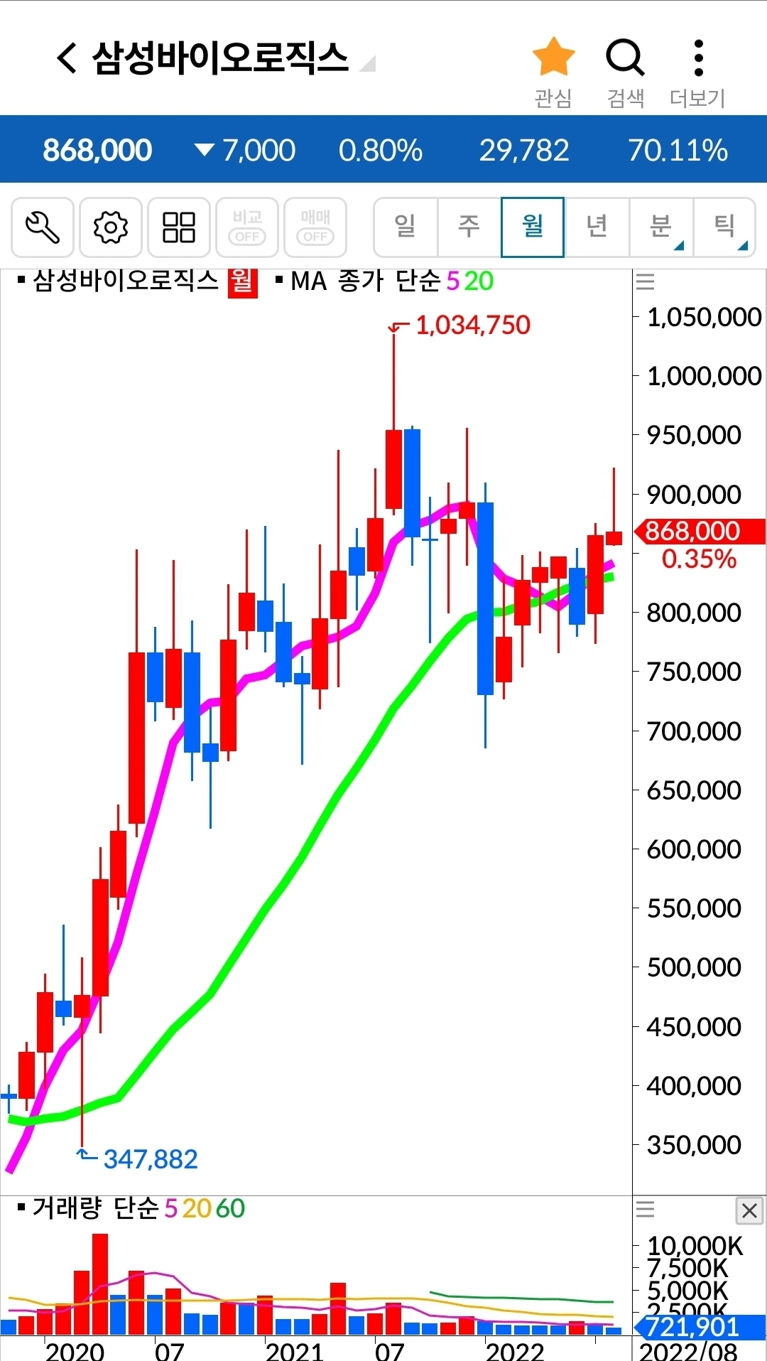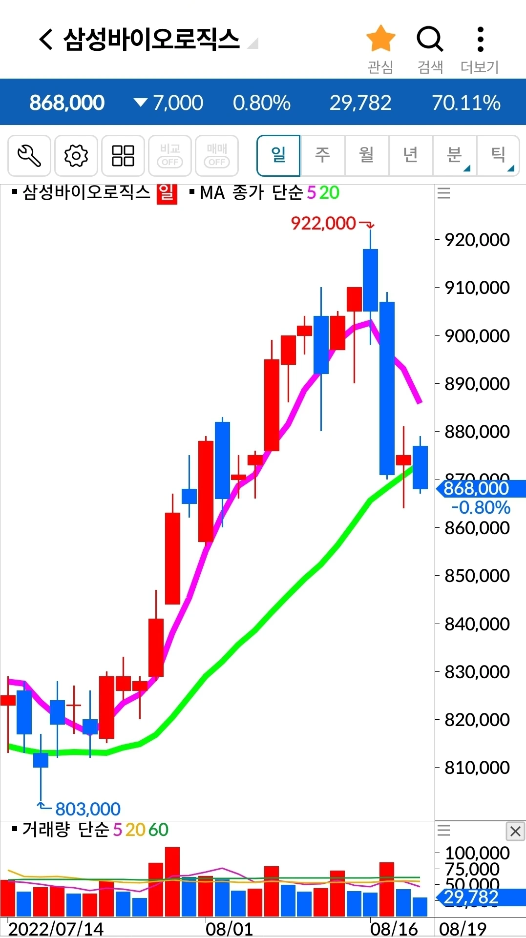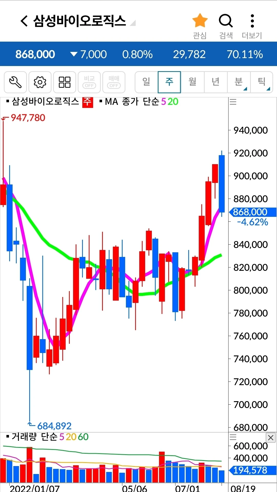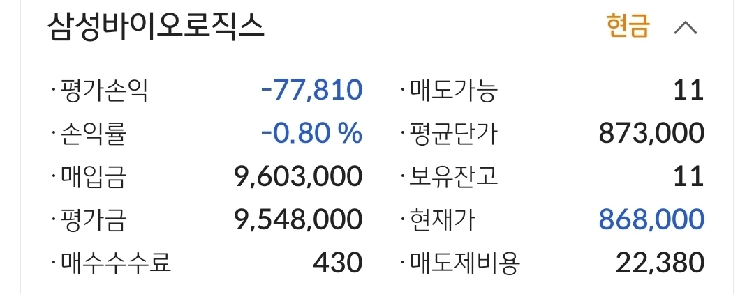 삼성 바이오로직스. 7만 원 손실 중.