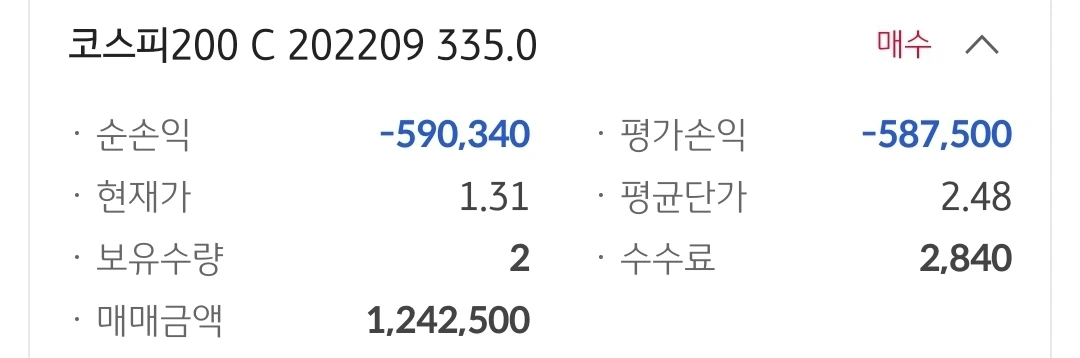 지수콜옵션 335 9월 물. 59만 원 손실 중.