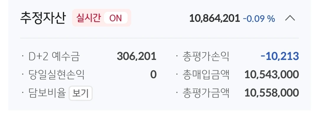 현물 계좌 추정자산. 1086만 원. 914만 원 손실 중.