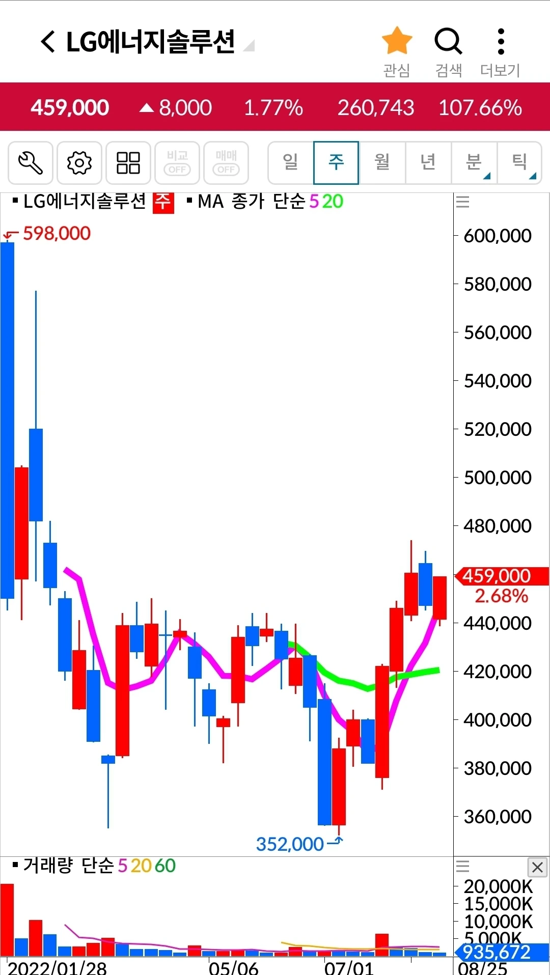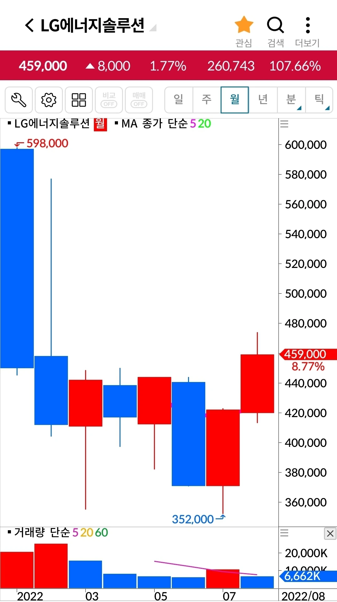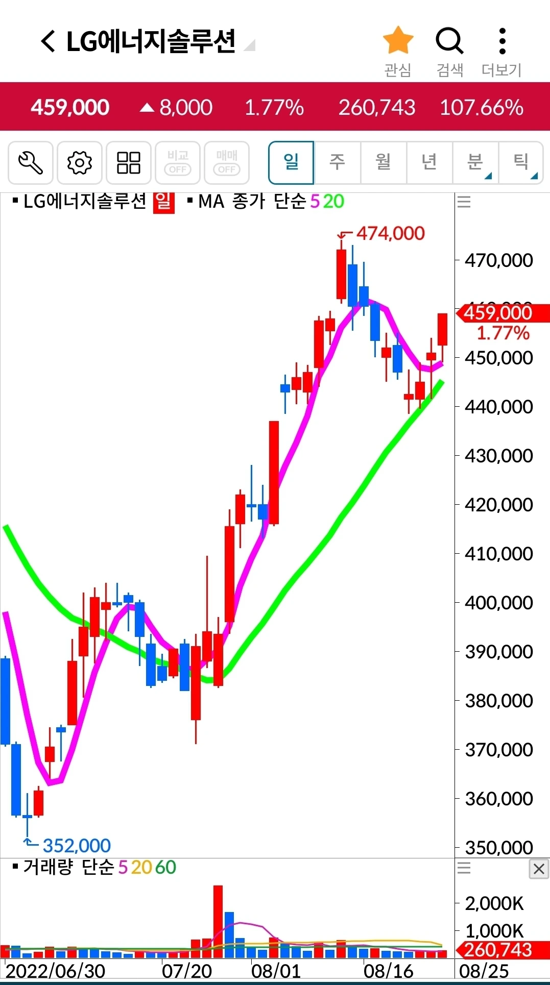 엘지에너지솔루션이 그야말로 빵! 위로 솟았다. 5일선이 20일 선 위에 있는 종목 중에서 고른 게 이렇게 수익을 낼 땐 참 기분이 좋다. 그래. 난 5일 선이 20일선 위에 있는 것들 중에서 위로 올라가는 걸 사면된다. 그리고 내가 할 수 있는 거라곤 그 5일선이 20일선을 아래로 뚫고 내려올 때 기계적으로 매도하는 것. 그것만 할 줄 알면 된다. 행여 다른 변명거리를 찾으며 그걸 실행 못할까 봐 난 자꾸 여기에 글을 적으며 다짐한다. 무슨 일이 있어도 요건 지킬 거라고. '난 아무것도 몰라요~ 5일선이 20일선 아래로 내려가면 매도할 뿐야요~'