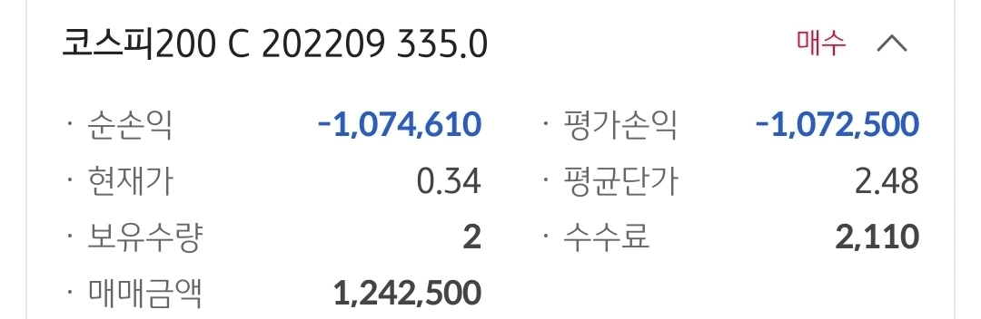 지수선물 콜옵션 335. 107만 원 손실 중.