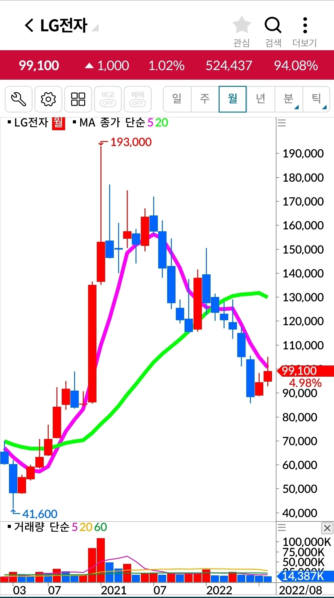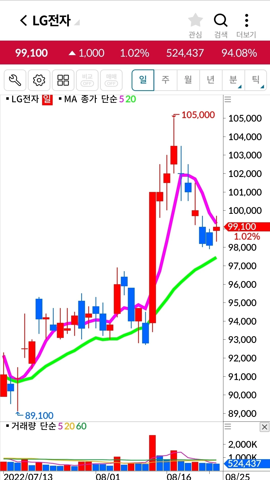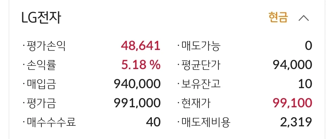 엘지전자. 4만 원 수익 중.