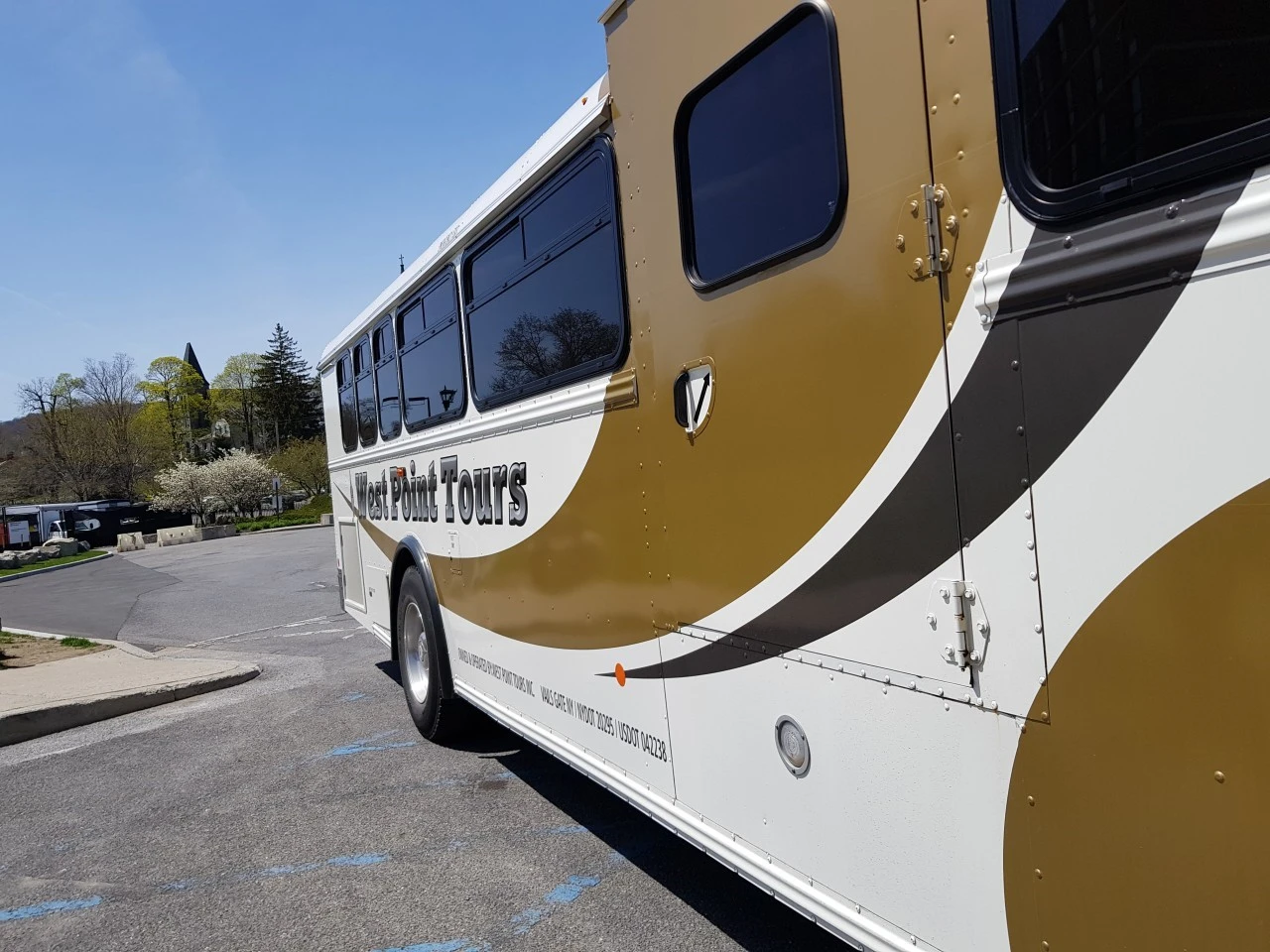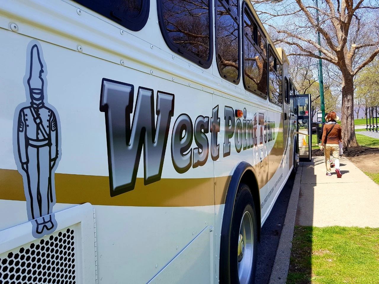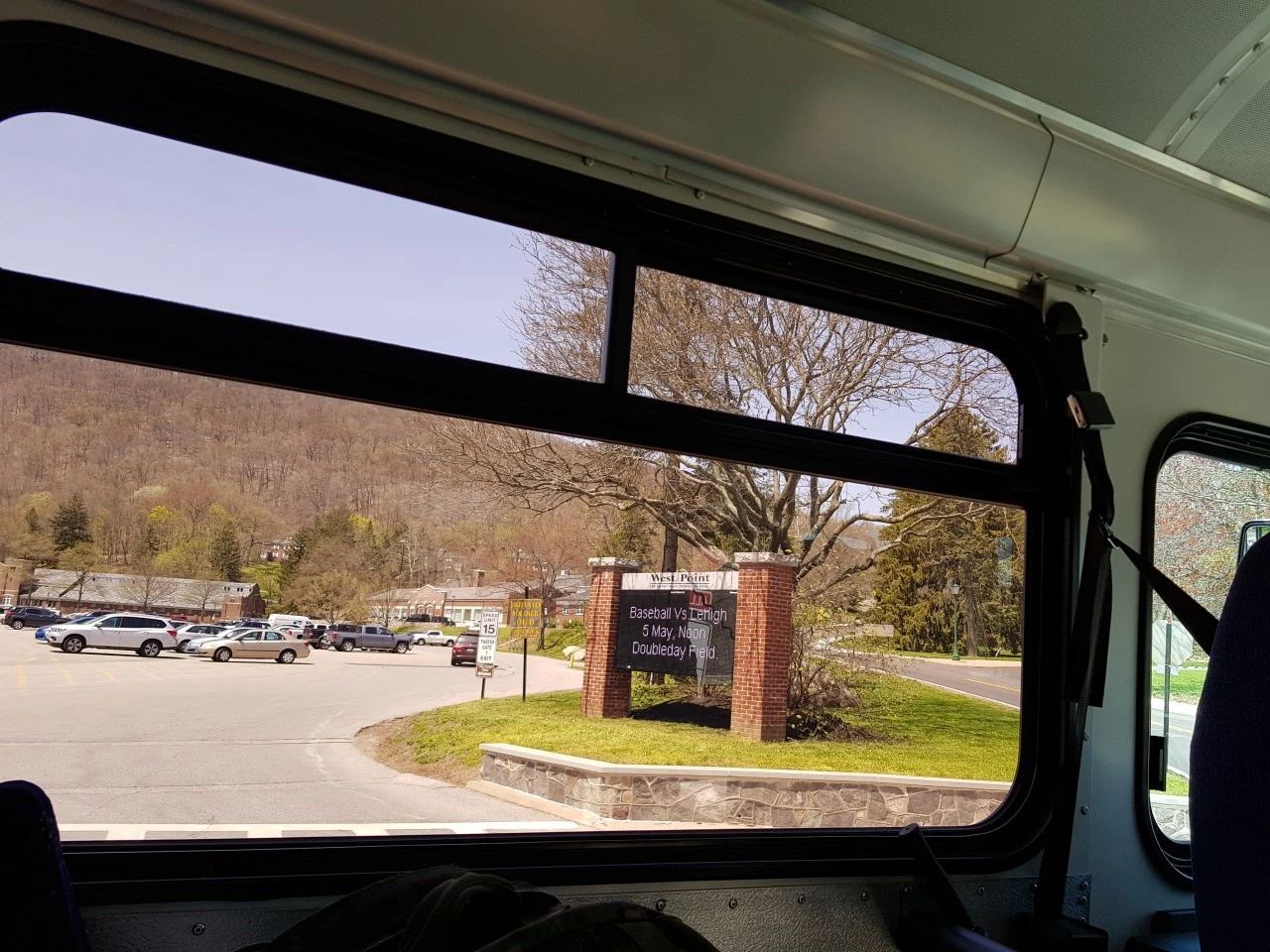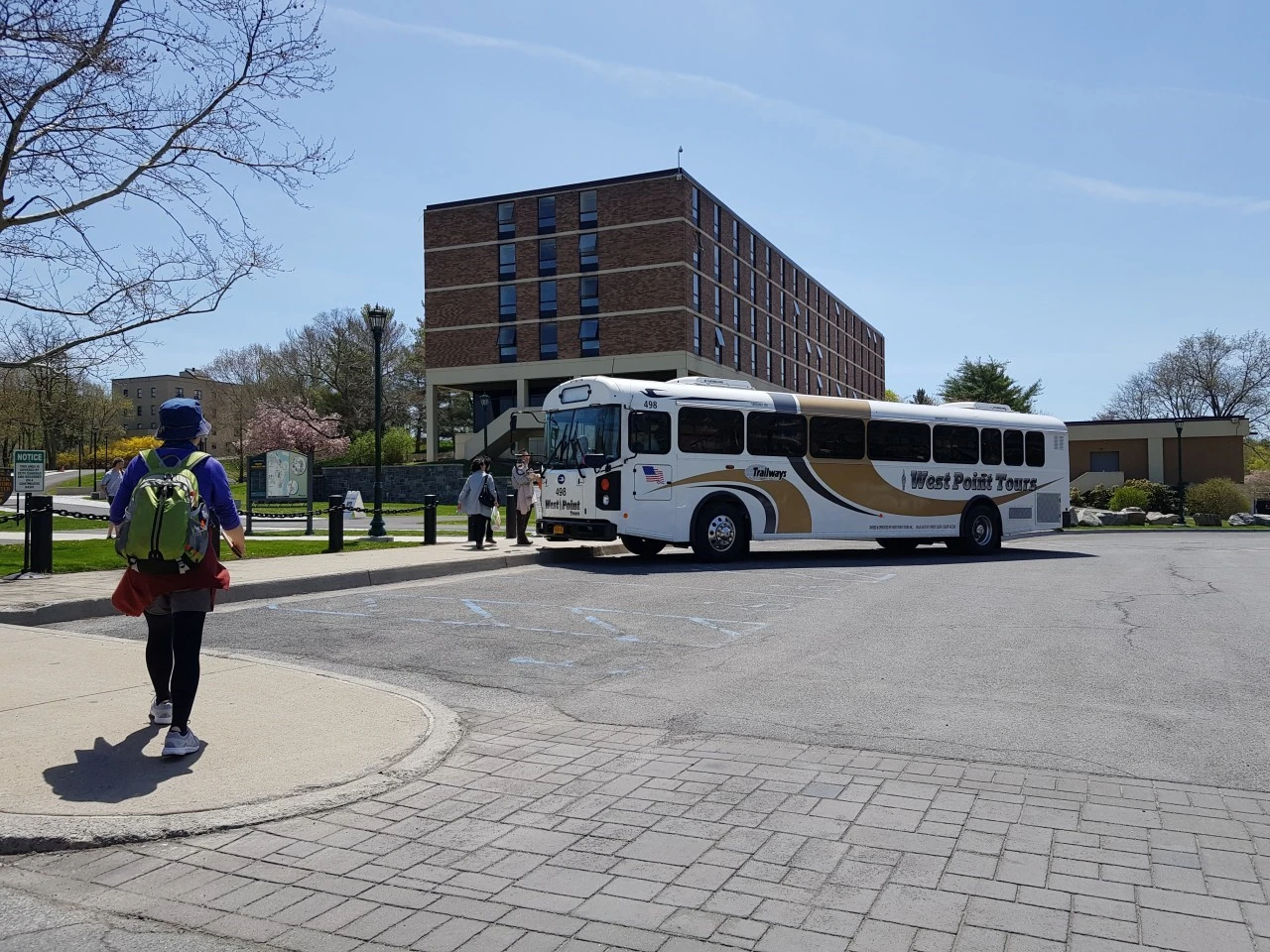 우리가 이 버스를 계약했던 방문객 센터가 옆으로 보인다. 그리고 정면의 아름다운 집은 교회 같다. 먹던 햄버거를 바리바리 커다란 비닐에 담고 그걸 혜정이랑 신덕이가 꽉 움켜쥐고 버스를 탄다. 점심을 먹다 만 채로. "West Point Tours" 버스에 쓰인 선명한 문구가 보이는 감? 하하 육군사관학교 관람 전용 버스다. 육군사관학교 투어버스 앞에서 인증숏. 오예. 우리 만이 아니다. 많은 외국인들이 함께 탑승한다. 아버지와 아들도