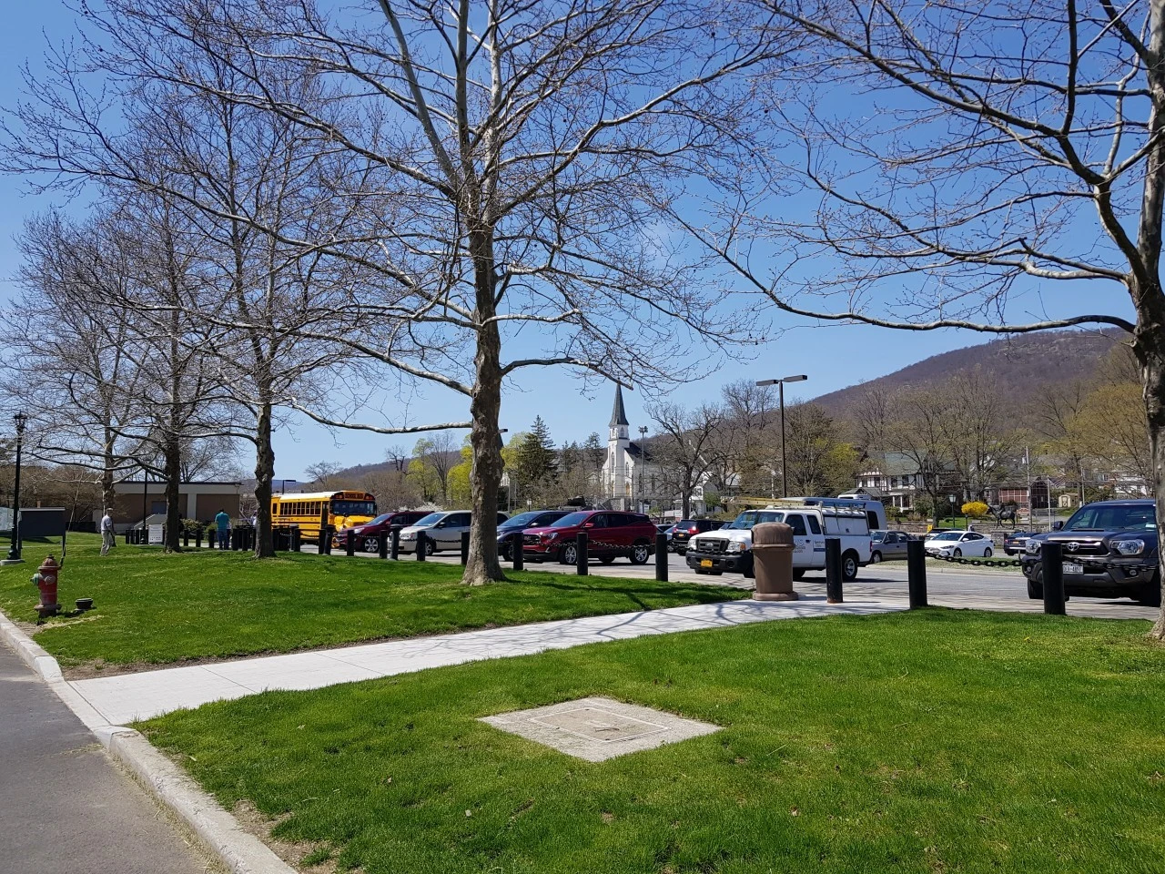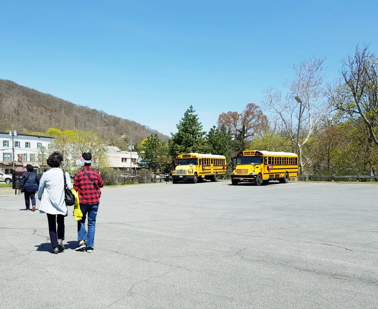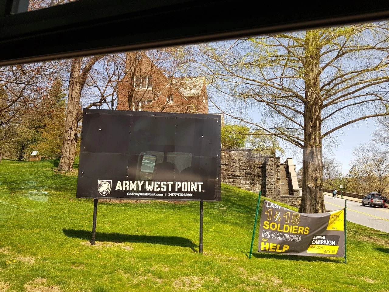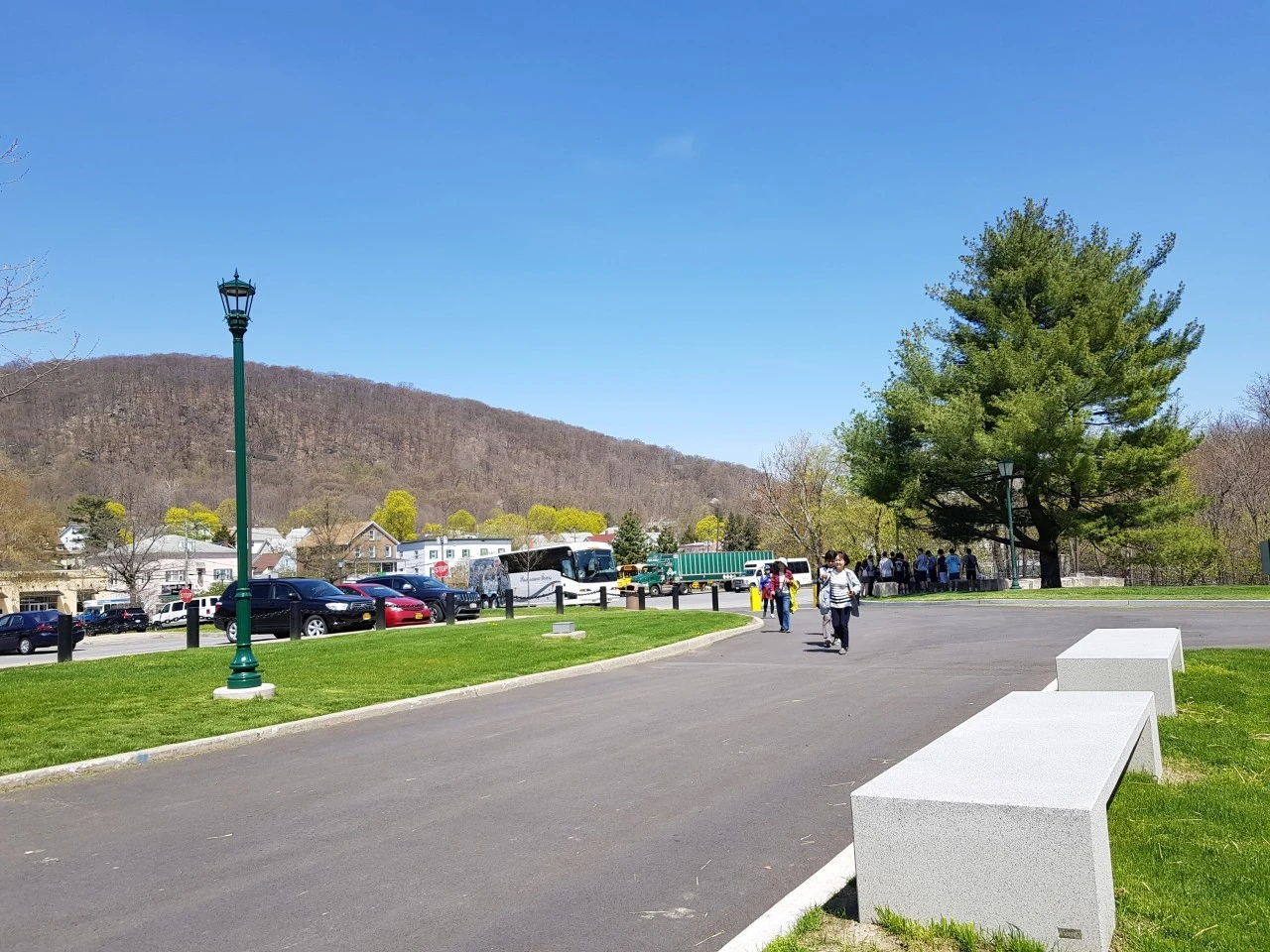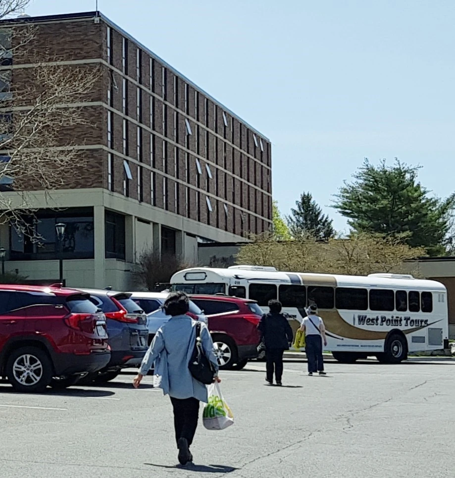 우리가 이 버스를 계약했던 방문객 센터가 옆으로 보인다. 그리고 정면의 아름다운 집은 교회 같다. 먹던 햄버거를 바리바리 커다란 비닐에 담고 그걸 혜정이랑 신덕이가 꽉 움켜쥐고 버스를 탄다. 점심을 먹다 만 채로. "West Point Tours" 버스에 쓰인 선명한 문구가 보이는 감? 하하 육군사관학교 관람 전용 버스다. 육군사관학교 투어버스 앞에서 인증숏. 오예. 우리 만이 아니다. 많은 외국인들이 함께 탑승한다. 아버지와 아들도