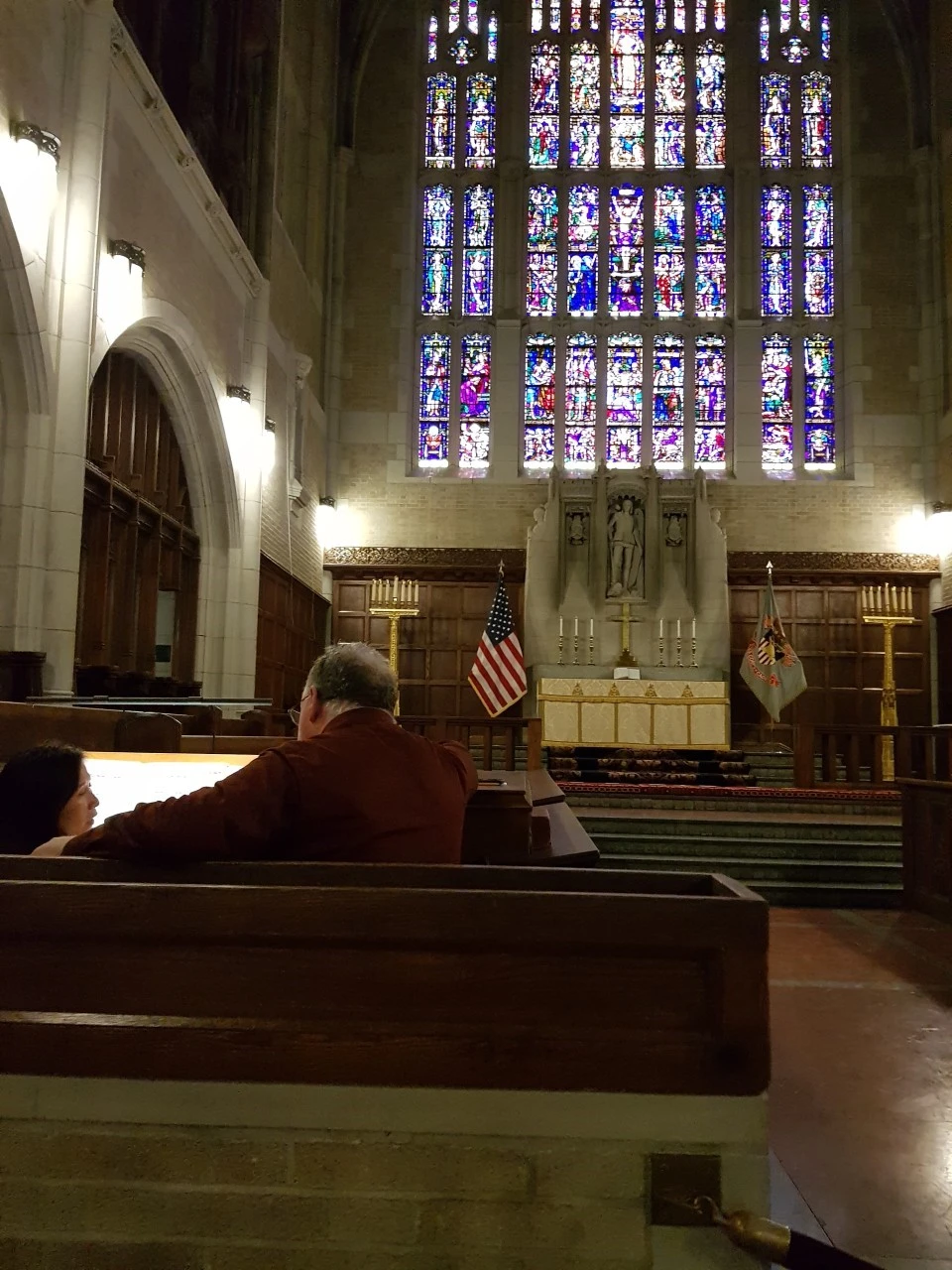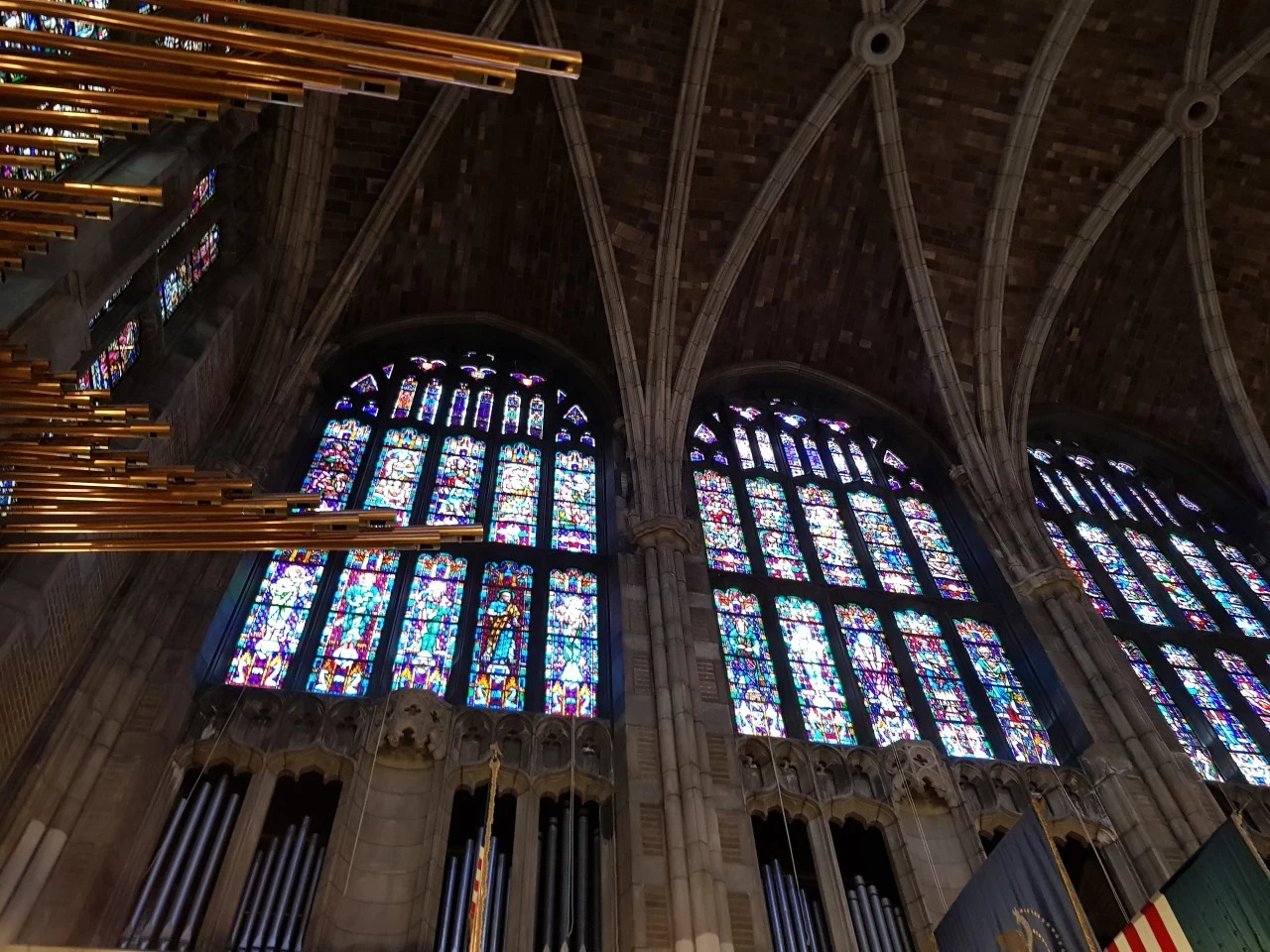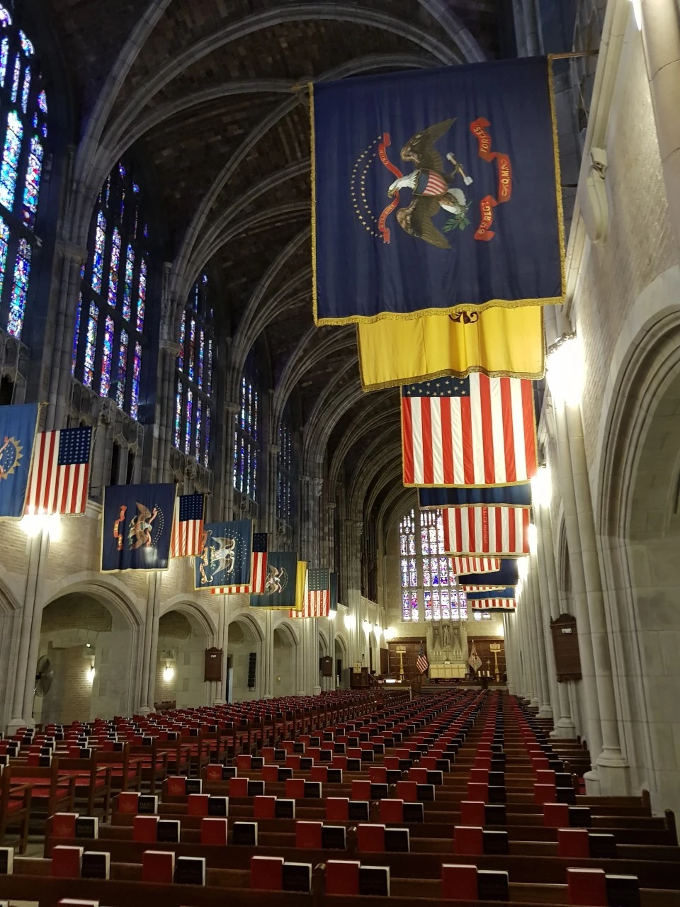 1910년에 지어진 고딕 양식의 석조건물 교회당 "Cadet Chapel". 교회 내부로 들어오니 가장 먼저 눈에 띄는 건 오홋. 쫘악 너무도 질서 정연하게 의자마다 놓여있는 빨간 책과 감색 책. 아마도 성경과 찬송가 아닐까. 우아아아아아~ 육군사관생도의 질서 감각이 실감 나는 순간이다. 하하.