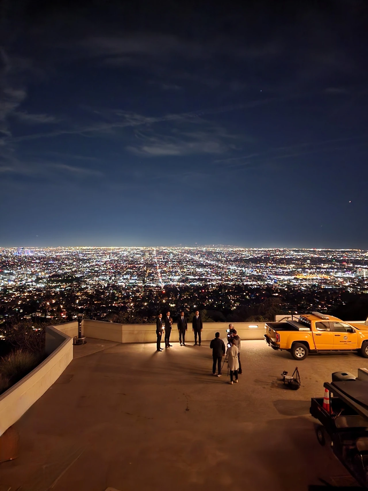 둥근 돔으로 되어있는 천문대 자체가 은은하게 빛나는데 참으로 매력적이다. 돔 곁으로 난 길을 따라 사람들 가는 대로 올라가 보니 앗 너무도 아름다운 화음. 모지? 사람들 시선이 아래를 향한다. 남성 4중 창단일까? 결혼식 축가일까? 아님 앨범을 낸 가수가 촬영만 하는 걸까? 결혼식 축가이기엔 너무도 프로 같은 화음이다. 그런데 아주 잠깐씩 밖에 안 들려준다. 노래 중심이 아니고 촬영 중심인 것 같다. 이렇게 저렇게 포즈를 바꾸어가며 잠깐 노래할 뿐이다. 우린 더 끝으로 돌아가 LA 시내를 맘껏 구경한다. 우아 정말 넓긴 넓다. 고층빌딩은 별로 없이 넓게 퍼져 반짝반짝 빛나는 LA 모습이 참 아름답다.