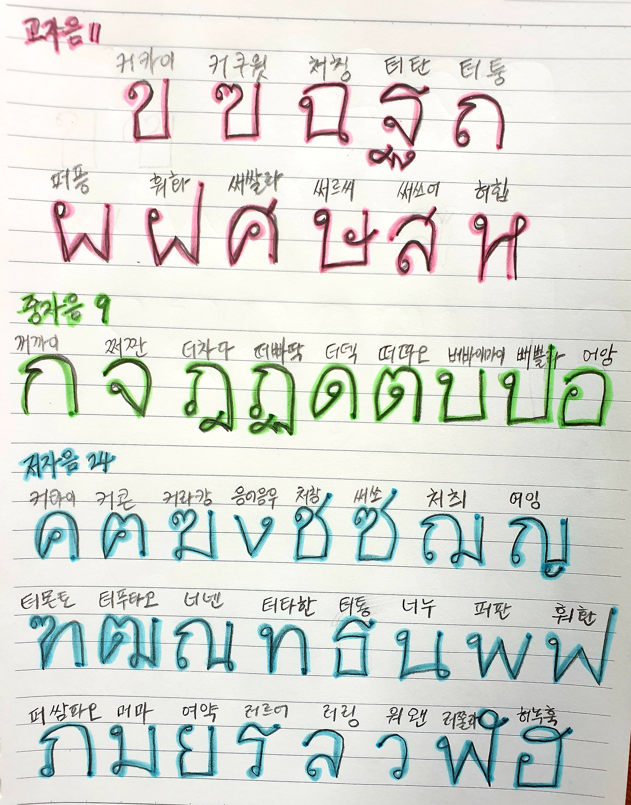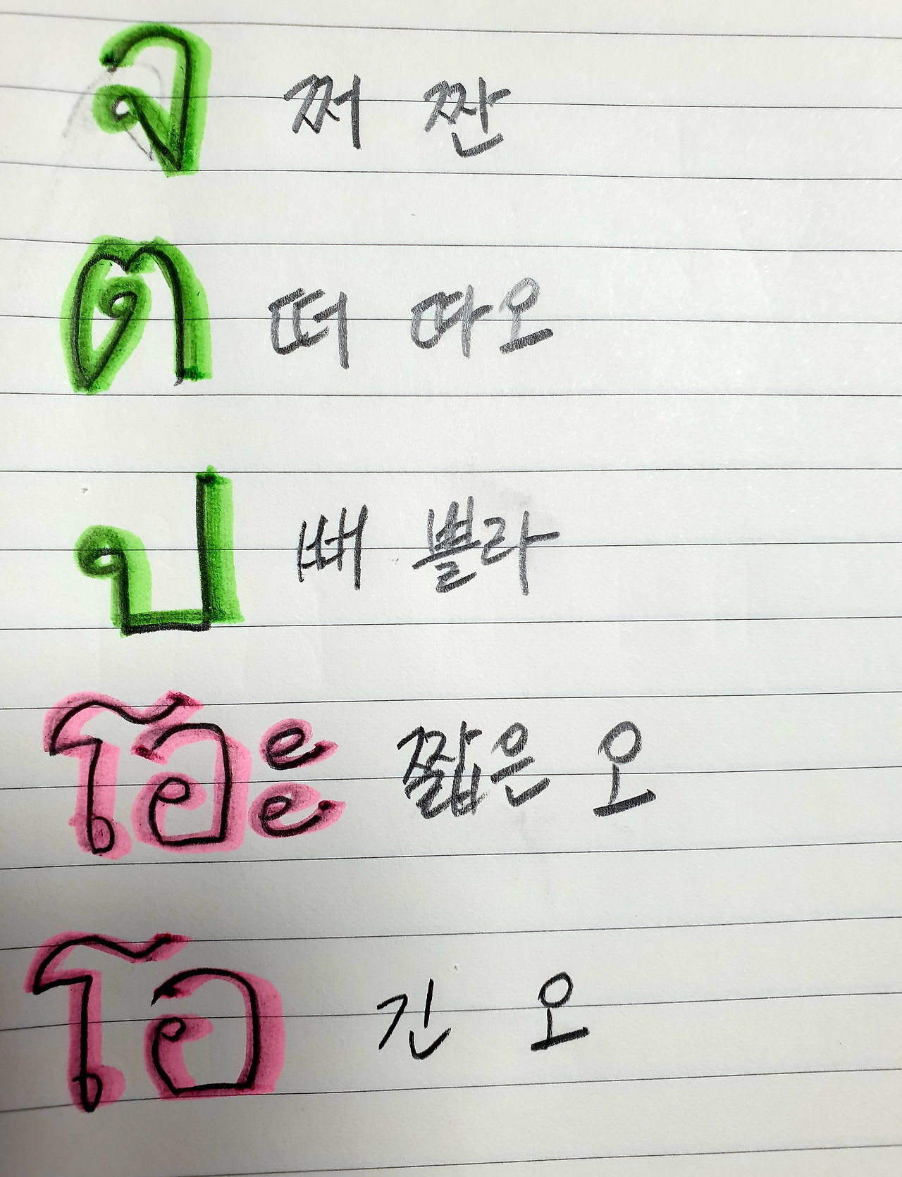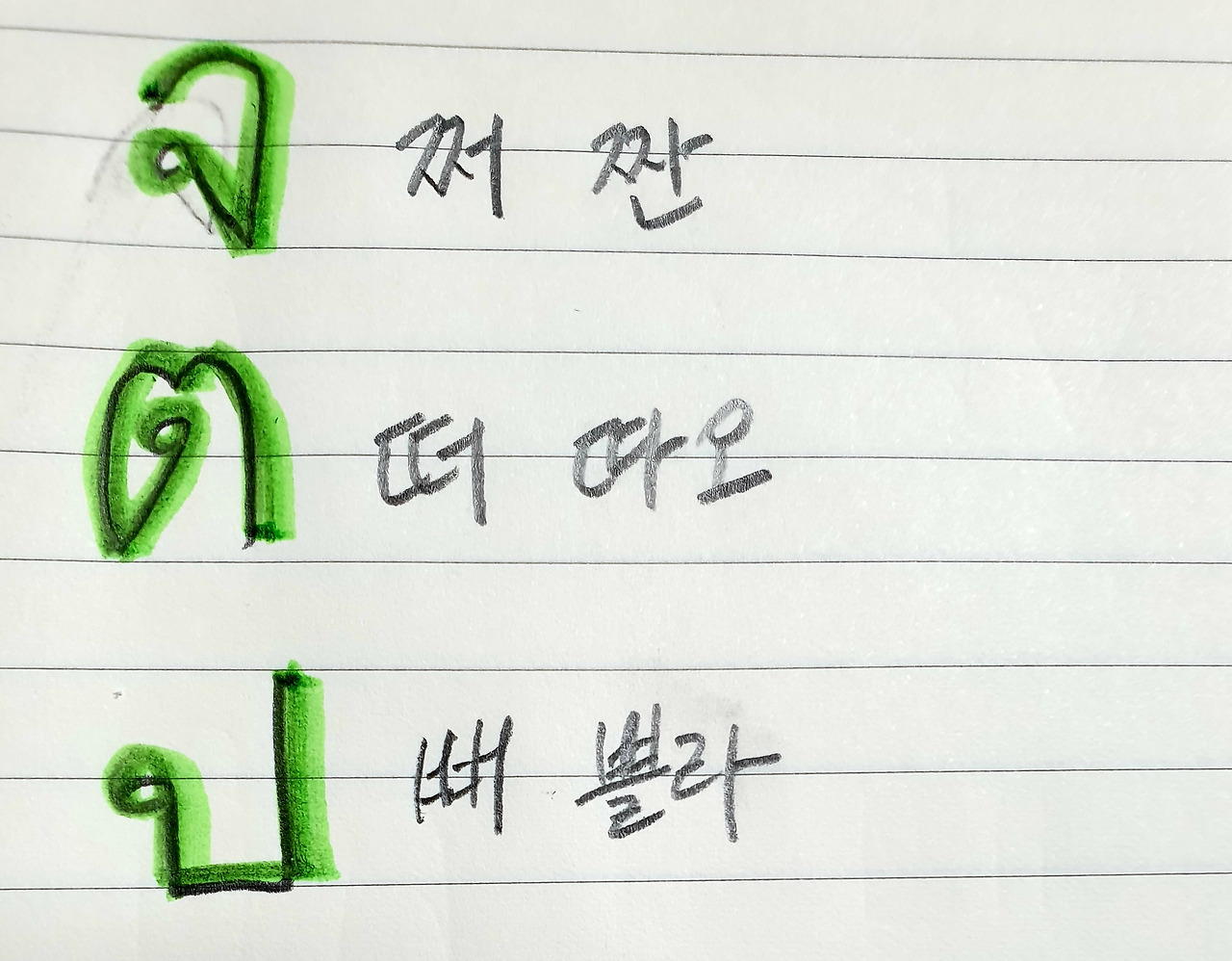태국어 제대로 공부하기 꺼까이 더덱 버바이마이 그리고 긴 모음 이 | 오늘 익힐 단어는 자음 시작할 때 우리나라 가나다라 할 때 가처럼 제일 먼저 나오는 것 꺼까이다. 중간에 있는 중자음 초록색으로 된 것 들 중에서 세 단어를 공부하자. 꺼까이 더덱 버바이마이 그리고 긴 모음 이. 자, 우선 세 단어 구경을 해보고~ ㅎㅎ 어쨌든 이 모든 단어는 초록색. 자음 표의 중간에 있던 중자음 들이구나. 한 개씩 찬찬히 들어가 봐