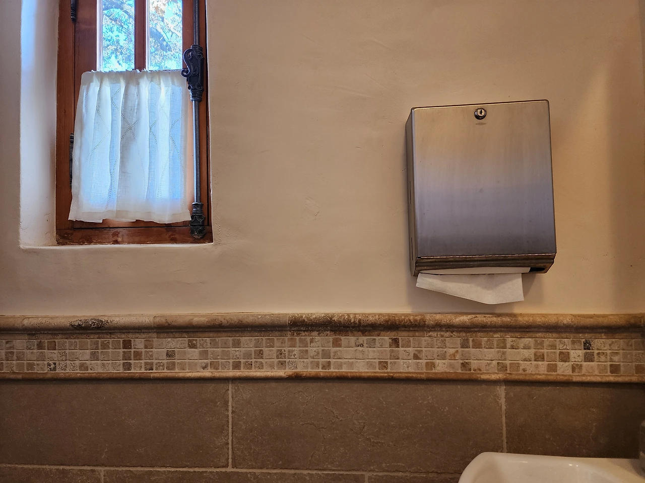 안으로 쑤욱 들어가니 역시 꽤 고풍스러운 흙담 같은 곳에 작게 Toilet이라고 쓰여 있다. 내 앞에 한 사람이 있을 뿐이다. 입구의 긴 줄을 생각하니 너무 다행이다. 화장실 안에 들어가니 오홋. 나무가 보이는 높은 창에 부드러운 커튼. 내리쬐는 햇살. 아니 화장실 풍경이 이리 아름다울 수가. 하하 볼일을 보면서 찰칵. 화장실이 이렇게 아늑하다니. 썬스톤 와이너리 자체가 기대만만이다.