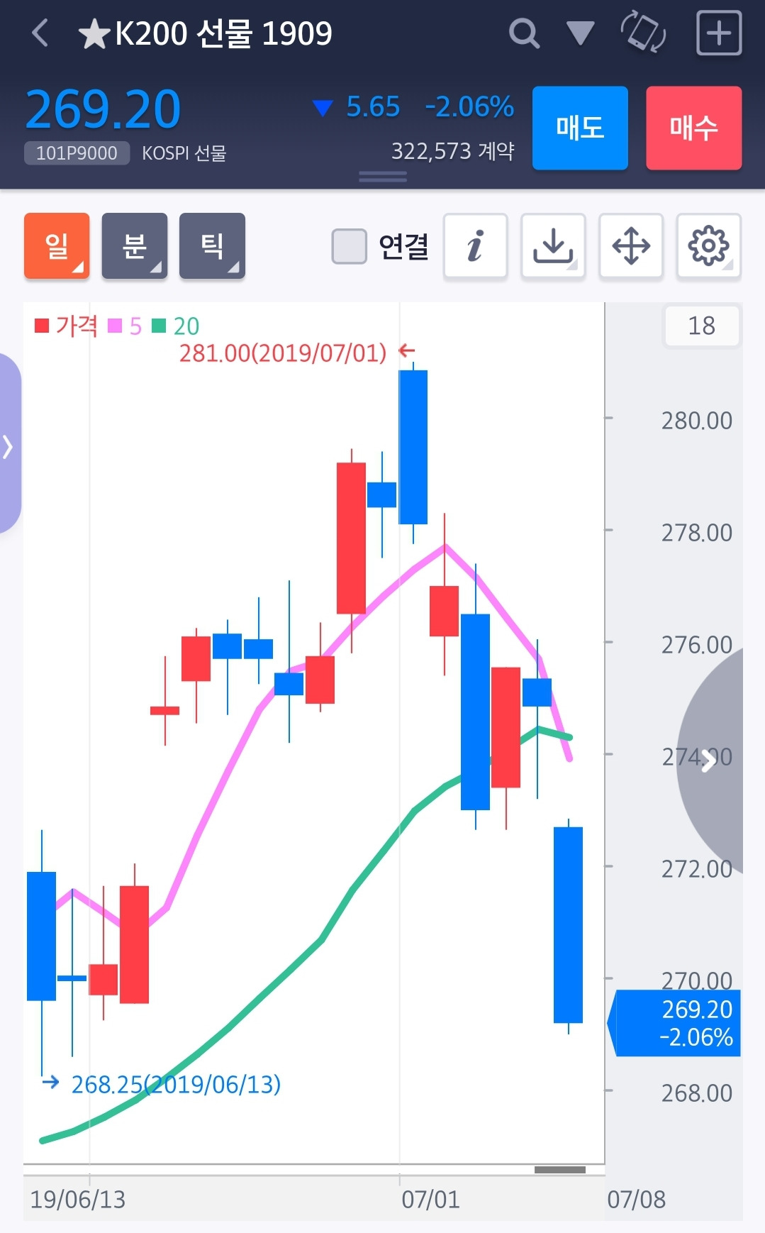 오늘 무려 5.65 포인트가 내렸다. 항상 지나고는 쉽다. 281을 찍던 그 고점에서 매수를 정리하고 쉬거나 했다면? 하하 그걸 어찌 알 수 있겠는가. 조금이나마 수익을 냈고 쉬고 있었으므로 자유롭게 매도에 진입하면 된다. 에측을 할 필요도 없다. 난 아무것도 모른다. 그저 나의 원칙만을 알 뿐. 5일선이 20일선 아래로 갔으니 내일 시초가에 매도한다. 이익이 나면 적당한 때 일단 이익 실현하는 것도 하나의 방법이 될 수 있겠다. 일단 난 내일 시초가 매도!!! 파이팅!!!