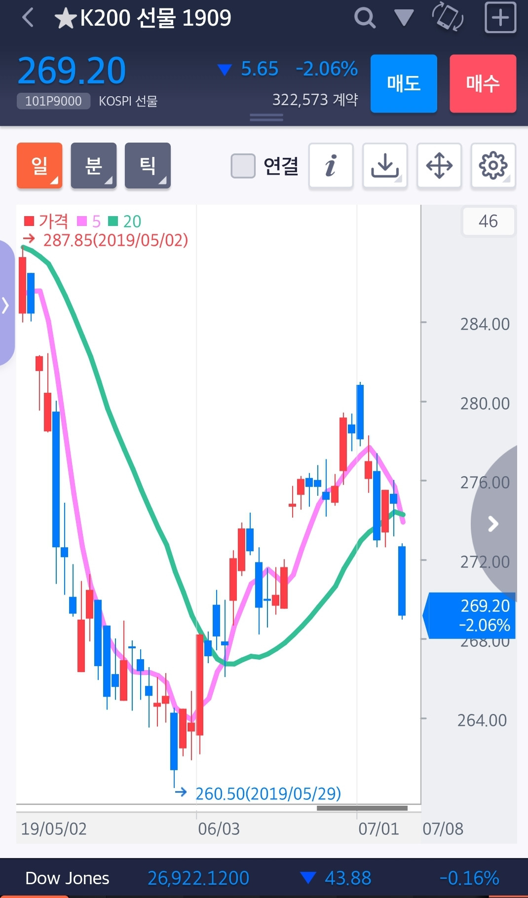 꽝! 드디어 충돌이 일어났다. 하하 무슨 지진 같은 게 난 게 아니라 선물투자 일봉을 보면 5일선이 20일선을 빵! 뚫고 내려갔다. 즉 내 멋대로 선물투자의 나의 단순한 원칙에서의 매매시점이 된 것이다. 나의 단순한 원칙이 무엇이냐? 난 아무것도 몰라요 다만 5일선이 20일선 아래로 내려가면 다음날 시초가에 매도 올라가면 매수 그뿐이다. 그러므로 나는 내일 시초가에 매도를 할 것이다.