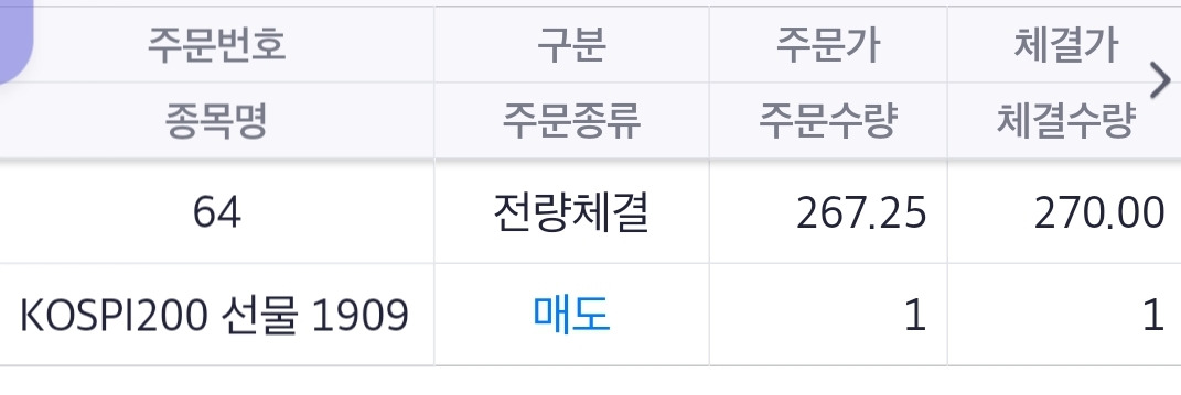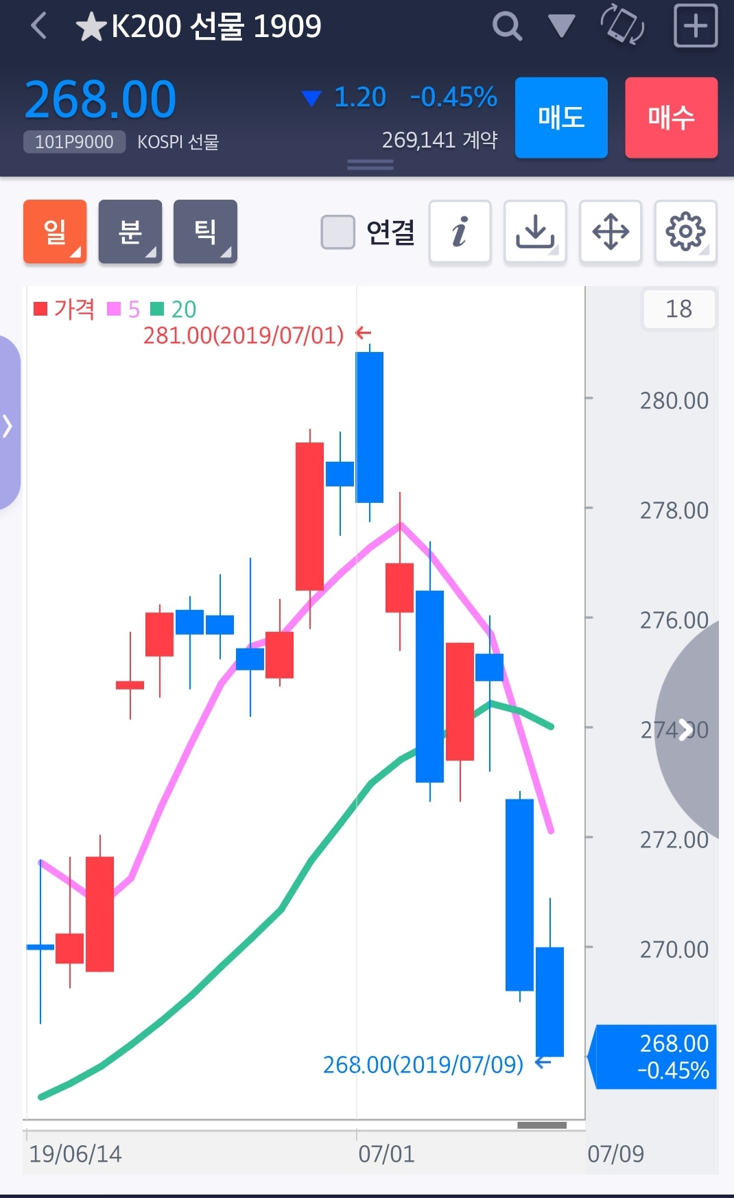 267.25 즉 아주 넉넉한 값에 시초가 매도 주문을 넣으니 270 에 체결이 된다. 일단 난 나의 원칙대로만 했으면 그것으로 잘 한 거다. 짝짝짝. 그런데 어제 많이 떨어졌기 때문에 이런 때 사실 매도에 가담하기는 쉽지 않다. 언제라도 팡! 튀어오를 것만 같기 때문이다. 자꾸만 바닥을 잡고 싶은 맘. 꼭 내가 지금 매수하면 아주 바닥에 잘 잡을 것만 같은 맘. 그런 걸 꾹 참고 내가 지키기로 한 좀 우매한 듯도 싶고 너무 단순한 것도 같지만 어쨌든 지키기로 한 것을 지켜내는 게 중요하다. 난 이번 한 해는 딱 1계약으로 그저 5일선과 20일선의 충돌시에만 매매하기로 했으니 간당간당 마음 졸일 것도 없다. 파이팅.