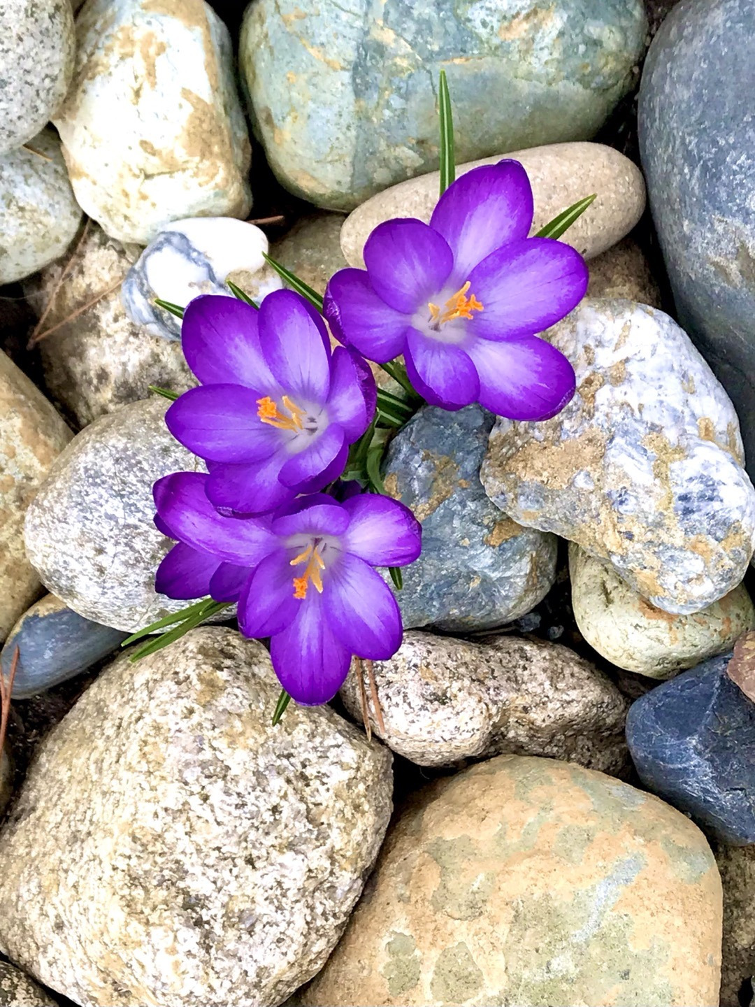 나에게는 멀리 미국에 80년대 초반부터 살고 있는 친구 H가 있다. 그 애는 사진을 정말 잘 찍는다. 요즘은 멀리 안 나가고 집 근처 또는 화원의 꽃들을 주로 찍는다. 그 애가 꽃을 찍으면 마치 꽃에 이름을 지어 불러주면 특별해지듯 그렇게 특별해진다. 보고 또 보고 자꾸 보게 된다. 한동안은 그 애가 찍어주는 꽃의 이름이 무엇인가? 어떤 꽃인가? 검색하여 확실히 알려고 했지만 하하 그건 내 스타일이 아니다. 그 꽃 이름이 무어면 어떠랴. 어차피 기억 못 할 거. 난 마냥 보고 또 볼뿐이다. 미술관에서 그림을 감상하듯, 좋은 음향기기로 음악을 듣듯, 이름도 몰라요 성도 몰라~ 그냥 꽃만 본다. 푸하하하 이게 내 스타일이다. 보면 볼수록 더욱 특별해지는 꽃. 특히 돌 사이에 피어난 이 꽃은 너무 예쁘다. 예쁜 꽃 곁에 있으니 못생긴 돌들도 예쁘다. 그 애들도 덩달아 특별해진다. 노란 꽃술과 복가시 보라색 꽃잎, 그리고 살짝 삐져나온 뾰족한 초록 잎, 모든 게 너무 예쁘다. 오늘은 나의 마음도 덩달아 예쁘게만 활동할 것 같다.