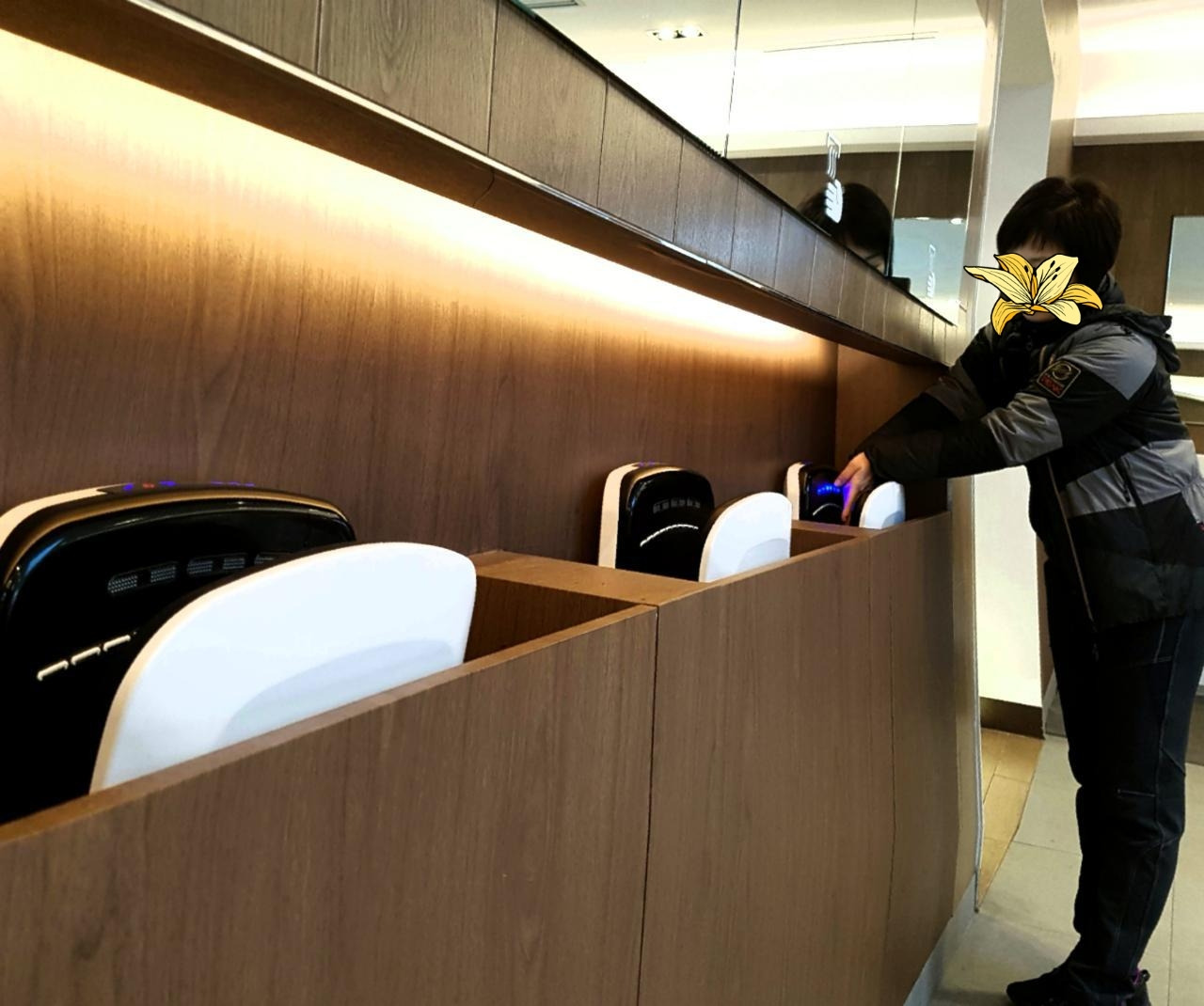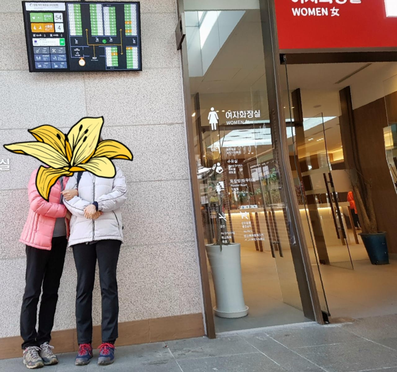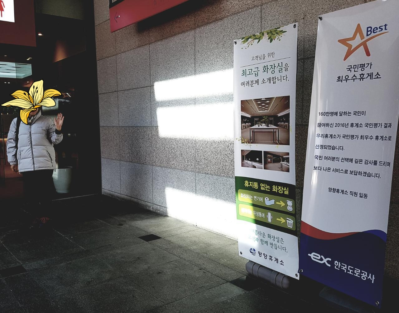 망향휴게소에 내린 우리는 너무도 멋진 화장실 모습에 입이 쩍 벌어진다. 어쩜~ 호텔 같아. 전국 일등 최고 화장실이래 인증샷 윤심아~ 폼 좀 잡아봐 찰칵 히히 어떻게 휴게소 화장실이 요리도 예쁘단 말이냐. 종란아~ 너도 이리 와. 하하 화장실 안에 윤심이와 종란이를 세워놓고 찰칵찰칵. 앗. 최고급 화장실이었어. 게다가 국민평가 최우수 휴게소. 어쩐지... 자. 요 거이 중요. 미경이와 최우수상 현수막을 함께 찍는다. 그뿐이냐. 혜영아. 저게 중요한 거야. 고속버스 좌석표 같은 바로 저 전광판. 화장실 어디가 비었는지 빈 곳이 몇 칸 인지 일목요연하게 보여주는 바로바로 저 전광판. 저걸 찍어야지. 해서 또 정애와 미경이를 함께 넣어 찰칵찰칵. 하하. 우린 화장실에서 이렇게 쌩쑈를 한다. ㅋㅋ