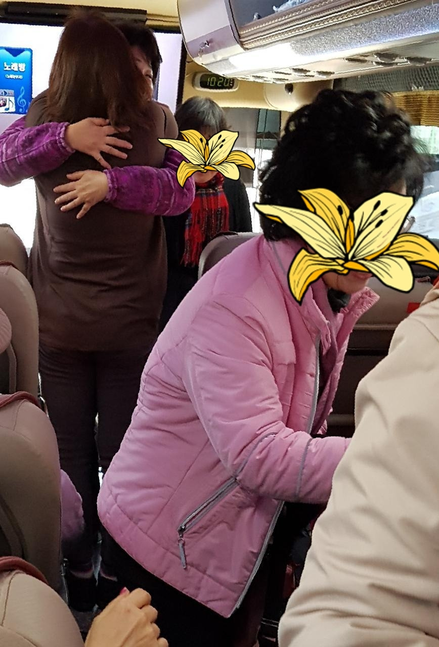 헉. 몽미? 기다리고 있어야 할 약속된 정류장에 아~ 무도 안 보인다. 우리의 길쌤. 부지런히 전화. 지금 오고 있대~ 뭐야. 아직 안 왔어? 한 참을 기다린다. 드디어~ 생글생글 방글방글 즐겁게 등장하는 우리의 대전팀. 오 예. 열화와 같은 박수 세례를 받으며 '정신여고 동창회' 버스 입성. 헤헤.