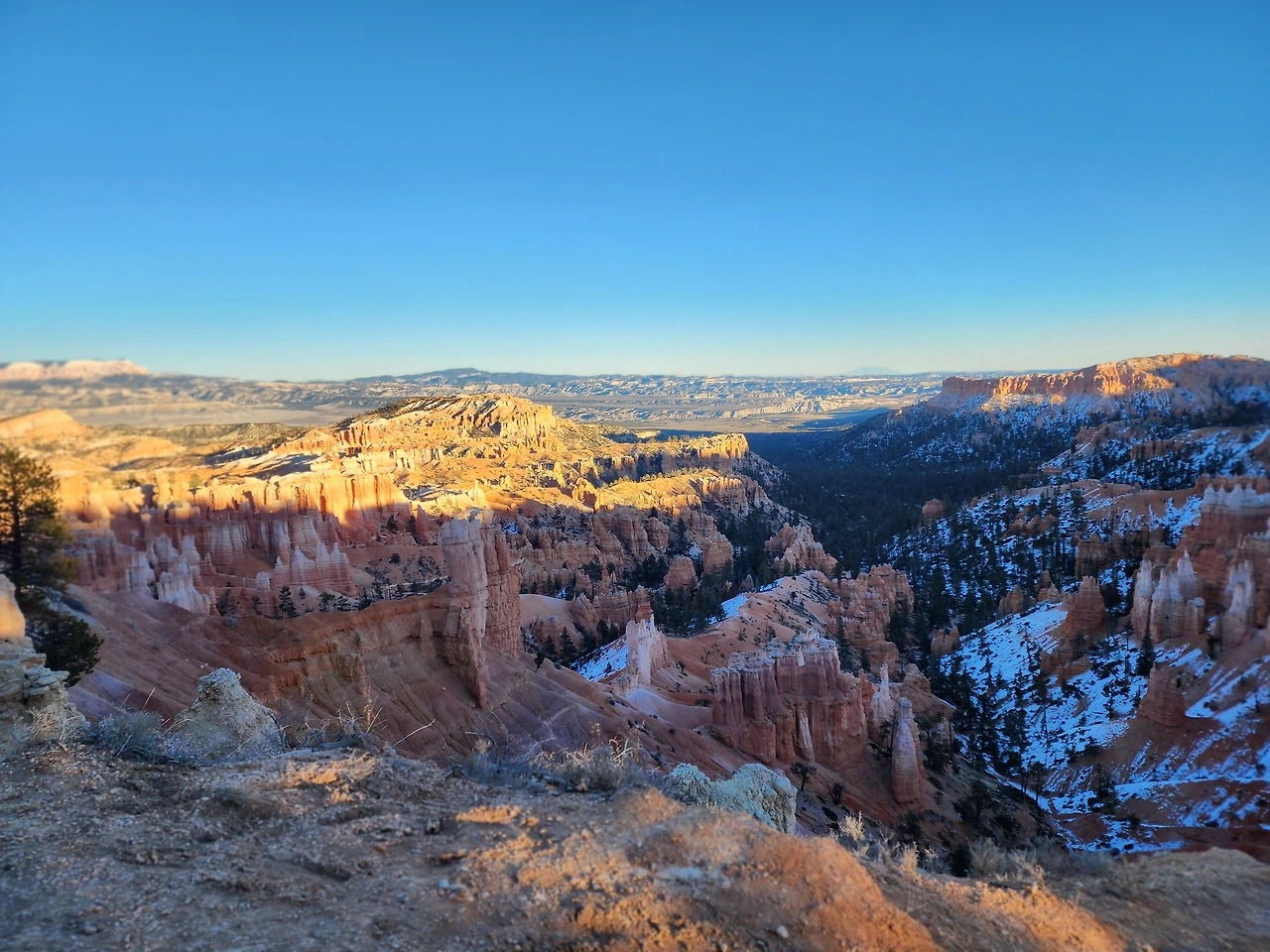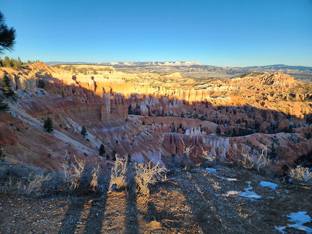 셀카봉으로 인생샷을 남기려 하지만 후들후들 여차하면 그 거대한 절벽 밑으로 떨어져 버릴 것만 같아 조심 또 조심이다. 초현실적인 바위 모습도 신기한데 수백만 년 수억 년 걸린 것이라니 그 세월을 가늠해 본다. 이곳은 여름이 성수기다. 지금은 겨울이 코앞이면서 땡스기빙 휴가철이라 한산하기 그지없다. 사람도 차도 별로 없어 맘껏 감상한다. 보고 보고 또 본다. 춥지만 상관없다. 눈이 확 트이게 넓으면서도 기괴한 암석들의 모습이 가슴을 톡톡 두드린다.