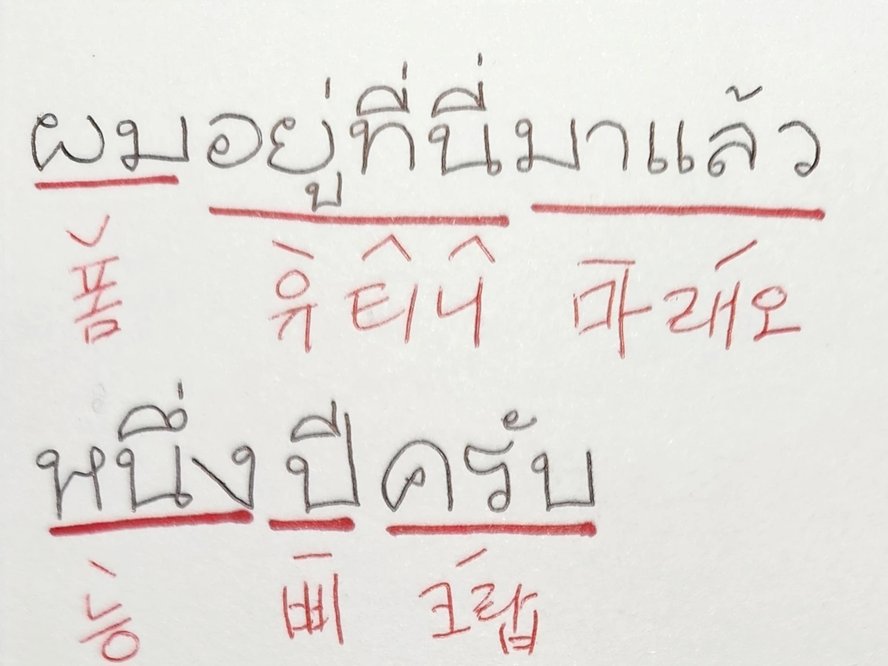 일단 태국어로 여기 온 지 1년 되었어요~ 는 폼 유티니 마래오 능삐 크랍이다. 앞에 폼이 붙었고 뒤에 크랍이 붙었으니 물론 남자가 말할 때이다. 띄어쓰기가 없는 태국어는 몽땅 붙여 쓰지만 우린 읽기 쉽게 단어마다 띄어볼까?
