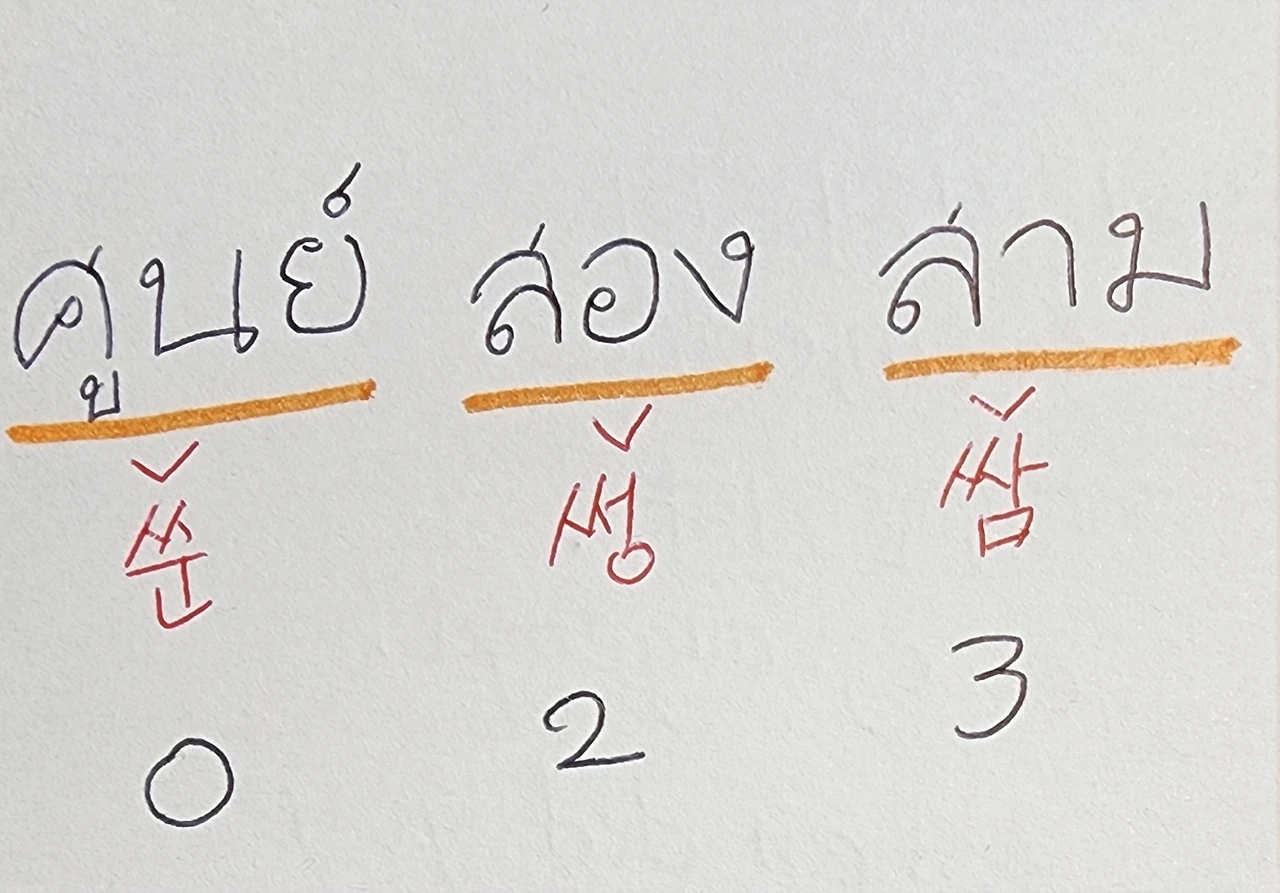 쑨 썽 쌈 ศูนย์ สอง สาม 0, 2, 3. 영, 둘, 셋.