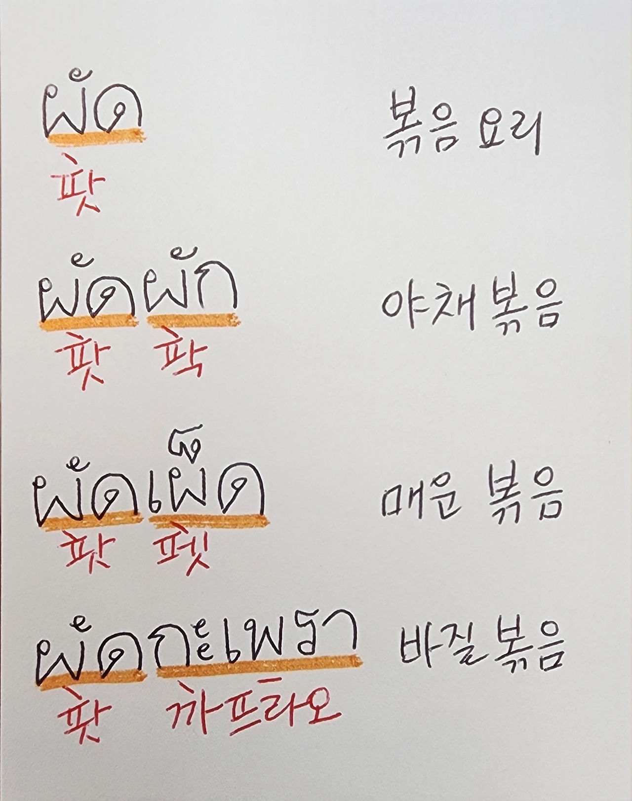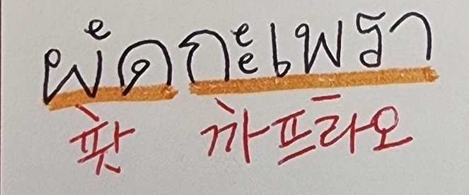 오늘은 태국의 요리 중 볶음요리 입니다. 우선 볶다라는 뜻의 말은 팟ผัด이 있습니다. 거기 야채라는 뜻의 팍ผัก을 붙여 팟팍ผัดผัก 하면 야채 볶음. 맵다는 뜻의 펫เผ็ด을 붙여 팟펫ผัดเผ็ด하면 매운 볶음. 바질이라는 뜻의 까프라오กะเพรา를 붙여 팟까프라오ผัดกะเพรา 하면 바질볶음이 되겠습니다.