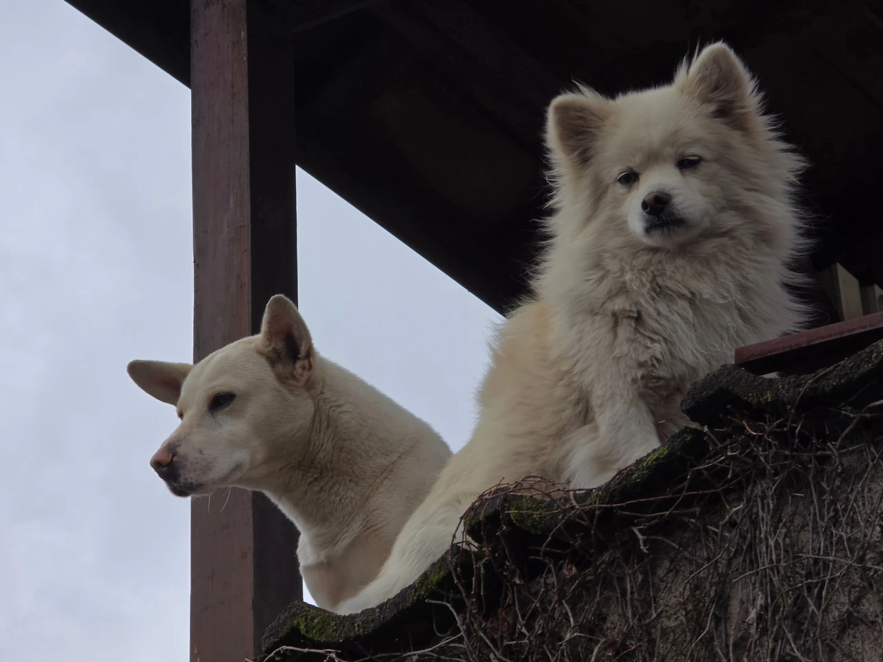 아침 내내 비가 왔지만 11시쯤 개는 것 같아 우리는 밭으로 향했다. 풀이 자리 잡기 전 빨리 부직포를 깔기 위해서다. 길게 세 줄로 되어 있는 우리 밭에 첫째 날 가운데 줄에 길게 부직포를 깔았고 두 번째 날 그 위쪽에 깔았는데 중간에 부직포가 떨어져 가 나랑 남편은 새 걸 사러 농협 판매장으로 갔고 S와 남편은 그대로 남은 걸로 하고 있었다. 게다가 우리는 약속이 있어서 새로 산 커다란 부직포만 창고에 넣어두고 나와야 했다. S 부부는 그 후에도 두 시간이나 더 부직포를 깔았다. 그게 미안해 우리는 오늘 함께 하기로 한 날짜도 아니지만 달려갔던 것이다. 우리 밭으로 가려면 큰길에서 옆에 좔좔 흘러가는 천을 따라 위로 올라가야 한다. 그리로 가다 보면 높은 축대가 나오고 그 위에 또 높은 담 그 위에 또 작은 원두막 같은 게 있어 올려다보며 호기심 천국 나는 저건 뭘까? 항상 궁금했었다. 앗 그런데 오늘 거기! 개가 두 마리 있는 거다. 나 만큼이나 호기심 천국인지 높은 담 원두막 위에서 바깥을 둘러보고 있다. 오호 저건 바로 저 개들을 위한 망루였던가? 여보 잠깐! 차를 멈추게 하고 차 창을 열어 위로 올려다보며 찰칵찰칵 그들을 찍었다. 나 따윈 관심에도 없는지 찰칵 소리가 나는데도 내게 눈길도 안 준다. 너무 높아서 소리가 안 들리기도 했겠지만. 하하 그래? 나도 그만 가련다. 우리 밭에 와 차에서 내리니 아직도 날씨는 너무 춥다. 4월이 다 되어 가는데 무슨 날씨가 이렇담? 바람이 무척 세다. 부직포를 들고 사과나무 있는 곳부터 쫙쫙 깔기 시작했다. 넷이 착착 리듬 맞춰할 땐 쉬웠는데 둘이 하려니 여간 힘든 게 아니다. 그래도 꽤 길게 깔았다. 정신없이 부직포를 깔고 있는데 빗방울이 살짝 비친다. 그리고 보니 시간도 꽤 되었다. 마침 쓰던 부직 포도 완전 끝이 났다. 그래 이젠 가도 좋겠구나 몸도 뻑쩍지근하다. 그래서 우리는 모든 걸 마무리했다. 다음에 와서 오늘 못한 걸 하면 된다. 너무 급하게 하지 말자. 즐겁게 하자 파이팅!