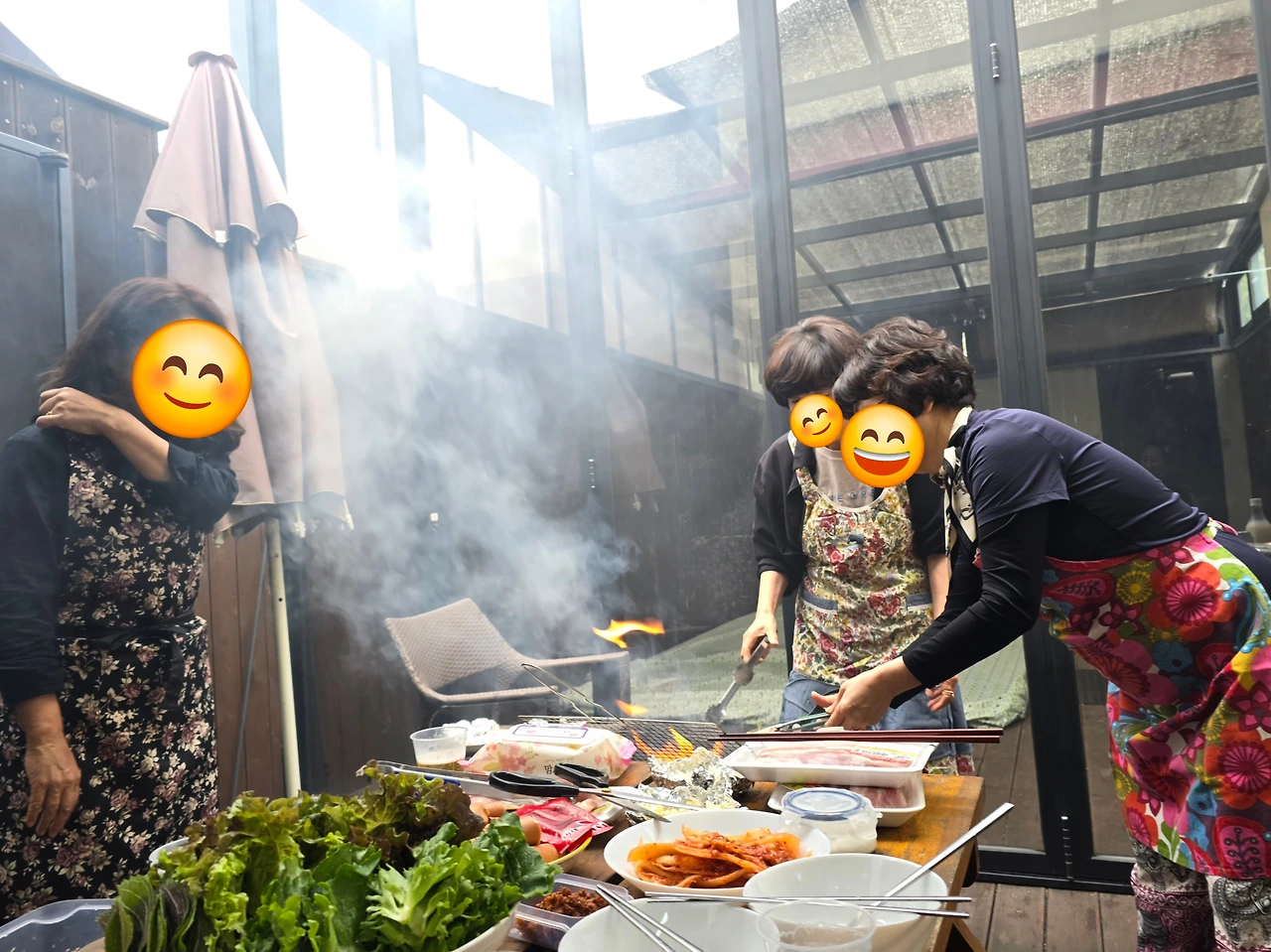 나에겐 일 년에 딱 한 번 일박이일 하는 모임이 있다. 물론 학부형들이다. 88년 생인 작은 아들이 고등학교 다닐 때 함께 학교일 하던 아래 학년 엄마들이다. 우리가 3학년 때 2학년 1학년 그리고 졸업하고도 몇 해까지. 그렇게 줄줄이 우리보다 어린 엄마들이다. 큰 행사 때마다 모이다 보니 친해졌는데 그 모임을 애들이 학교 졸업하고까지 계속 이어오고 있다. 흘러가는 세월 따라 이 모임도 정이 듬뿍 들었다. 바쁜 세월에 매달 만나기는 그렇고 두 달에 한 번씩 만나 밥을 먹고 이야기를 나누곤 했는데 그것도 바쁘다. 분기별로 만나자하다 그것도 바쁘네 아예 일 년에 딱 한 번 밤새 수다를 떨 자로 바뀌어 우린 그렇게 일 년에 한 번 특별한 행사를 갖는다. 세월 따라 엄마들도 나이가 들고 애들이 사회에 나가 결혼하고 애 낳는 행사가 이어지고 있다. 우리 모임의 막내인 총무 엄마가 맛있는 걸 정말 많이 준비해 왔다. 특히 삼겹살 바비큐 구이. 그런 바비큐를 할 수 있는 펜션까지 잘 구해놓았다. 남편들이 다 구워주는데 우리끼리 하니 불꽃이 하늘로 튀고 난리다. 우리 남편 보니까 이렇게 기름을 아래로 가게 하던데. 그래. 그렇게! 남편들이 맛있게 구워주던 걸 소환해 내며 난리 법석 통에 그래도 제대로 구워 먹었다. 남편들의 능숙함이 그리워졌다. 하하