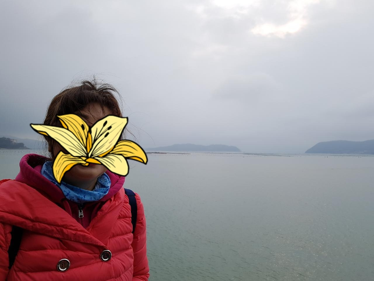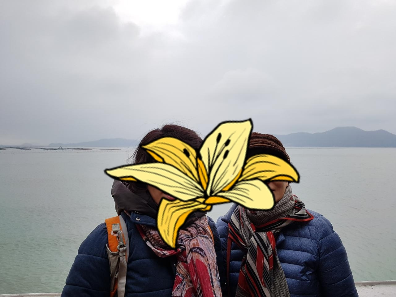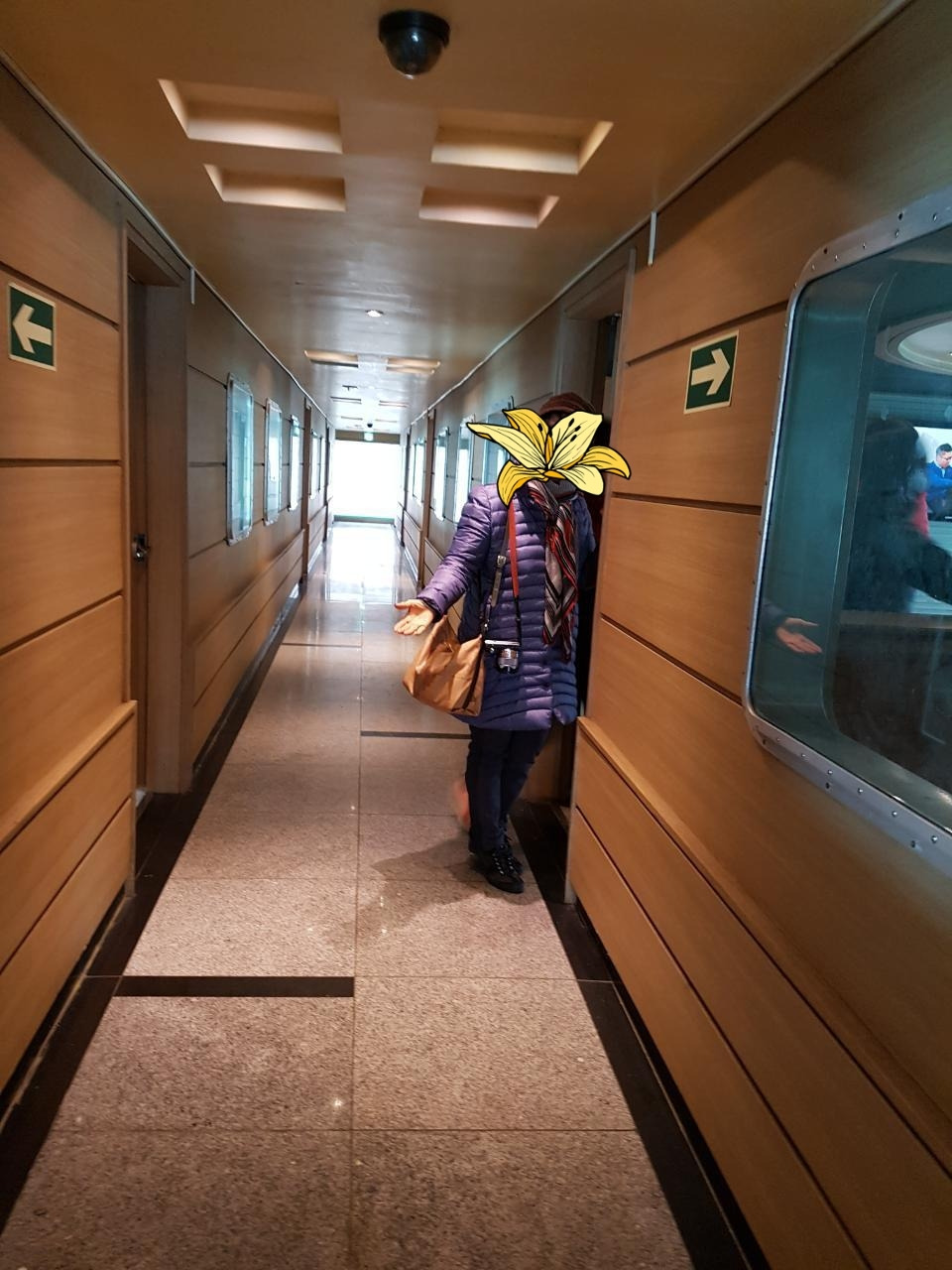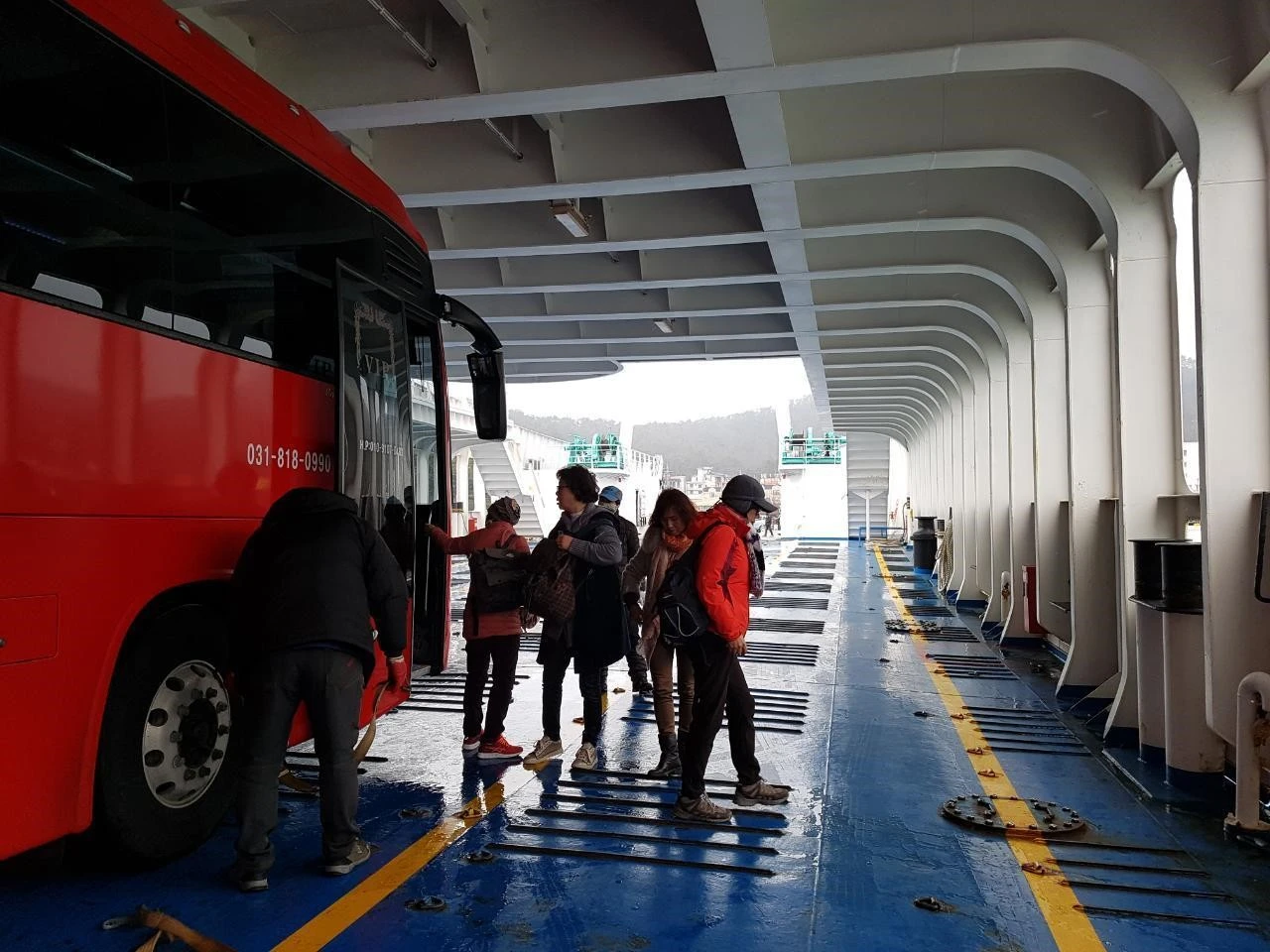 드디어 배를 탄다. 우리가 타고 있는 버스가 통째로 배 안으로 들어간다. 배 위에서 내려 선실로 이동한다. 캬~ 멋지다. 바다. 바다다. 우아. 바다야~ 점점 멀어지는 육지. 온통 회색빛 바다. 그 칙칙한 바다색을 단번에 제압하는 선옥이 빨강 잠바. ㅎㅎ 배 안으로 들어가기 직전. "옴마야~ 바다. 너무 멋져." 한 마디 씩 감탄을 쏟아내며 찰칵찰칵찰칵. 아. 모두들 너무 예뻐~ 다들 웃는데 우정이만 특별히 무뚝뚝한 표정. 조금만 웃어도 참 예쁠 텐데 전혀 그런 거에 상관없다. 하하