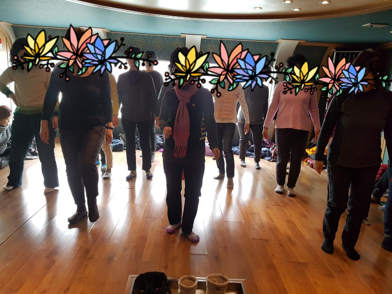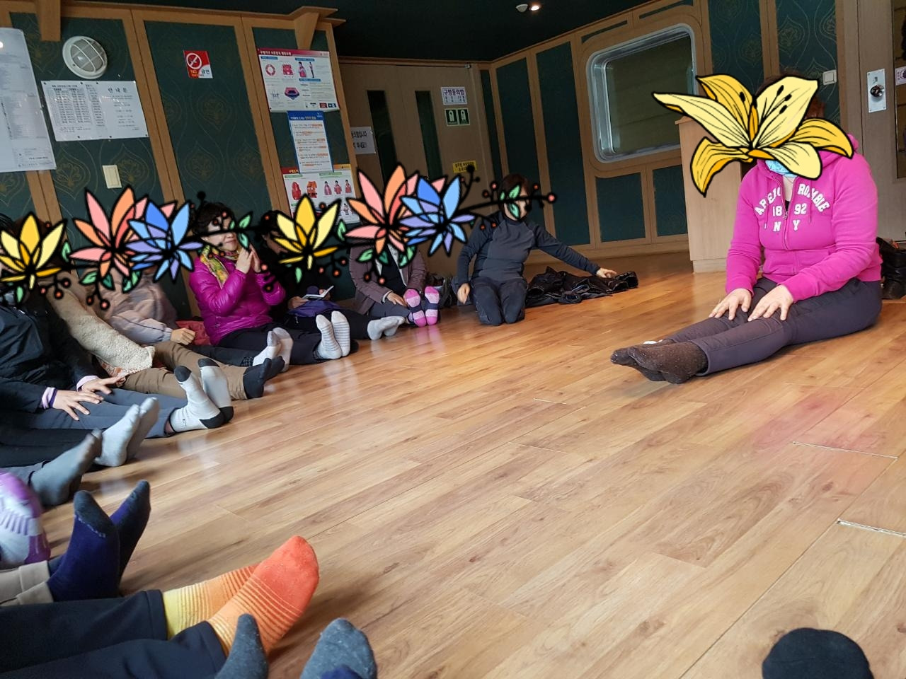 선옥이의 요가가 끝나자 이번엔 윤숙이. "손가락을 이렇게 요렇게." 계속 마주치며 수시로 해주라는 건강요법을 체득. 열심히 열심히. 잘 안돼~ 그래도 계속 계속. 오예. 우리 건강하게 오래오래. 윤숙이의 손가락 운동이 끝나자 이번엔 성옥이. "자. 모두 일어서~" 발을 앞으로 뒤로 옆으로 찍고 턴~ 다시 앞으로 뒤로 옆으로 찍고 턴~ 자격증까지 있는 우리의 호프 성옥 싸부님을 따라 라인댄스 열기. 하나 둘 셋넷~ 둘둘셋넷~ 돌고~ 찍고~