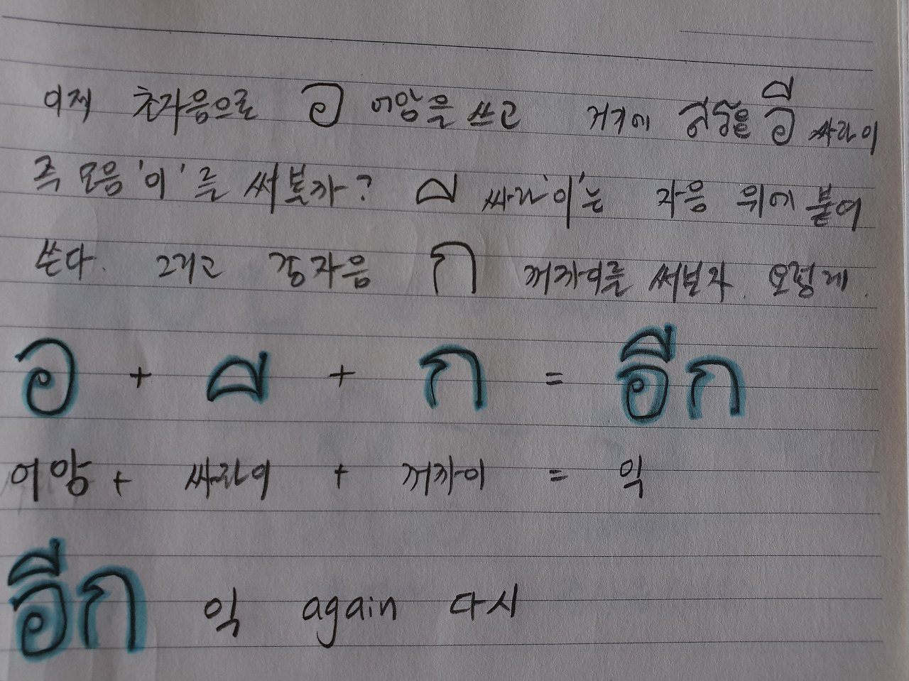 어앙 + 싸라 이 + 꺼까이 = 익 again 다시! 익 다시 쉽다. 이젠 요 정도는 예쁘게 쓸 수 있다. 다쉬! 할 때 익! 하면 되는 구나. 하하