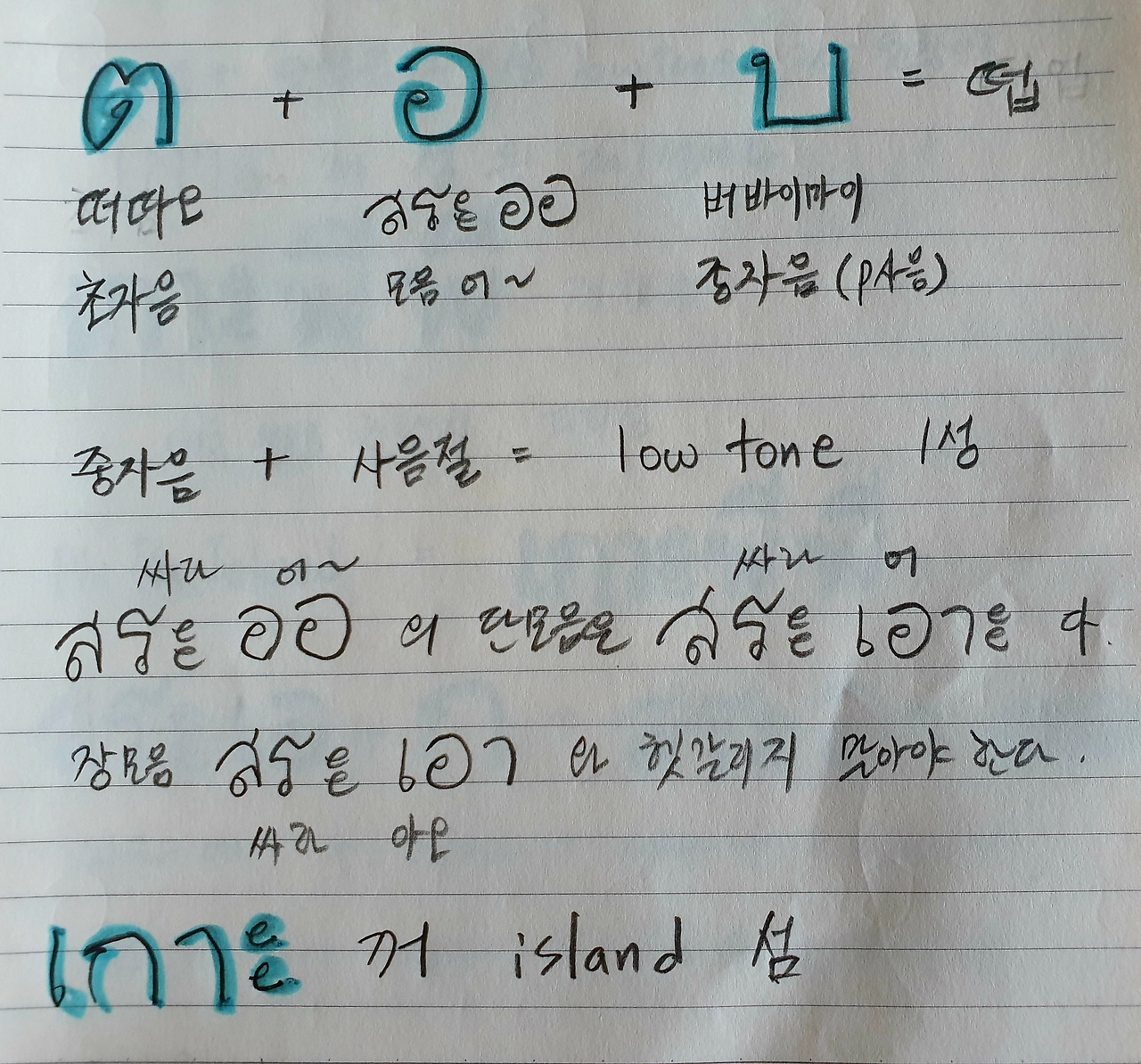 섬이라는 뜻으로 요건 단모음으로 끝났으니 사음엔딩으로 중자음 더하기 단모음은 제 1성. 즉 Low Tone 이다. 꺼! 아래에서 시작해 더 아래로 꺼! 섬이라는 뜻. 외우자.