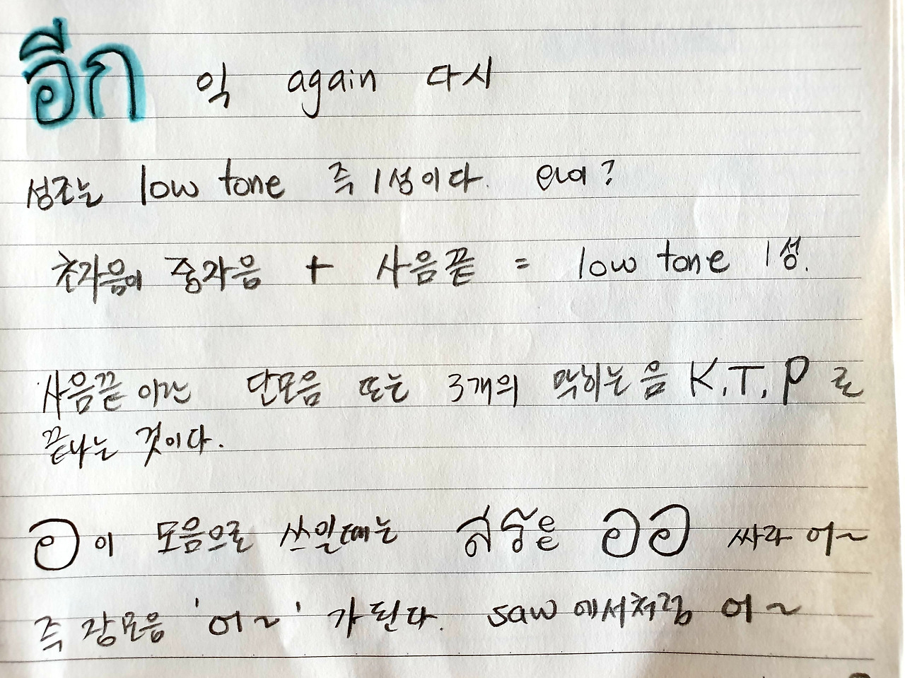 익은 좀 얕은 음에서 시작해 더 아래로 내려가는 low tone 즉 제 1성이다. 익. 밑으로 깔면서 익. 와이 1성이 되었을까? 중자음 어앙에 모음 이 그리고 익이니까 칵 막히는 K음, 사음이다. 그러니까 제 1성. 다시 외우자. 단모음이거나 사음 K, T, P. 요 세 마침으로 끝날 때 제 1성이다. 익 할 때 모음 이는 장모음이지만 종자음이 꺼까이로 칵 막히는 사음이기에 제 1성이 되는 것이다. 오호 그리고 어앙이 모음으로 쓰일 때는 싸라 어. 즉 장모음 어~ 가 된다. 오케이. 잘 기억하자.