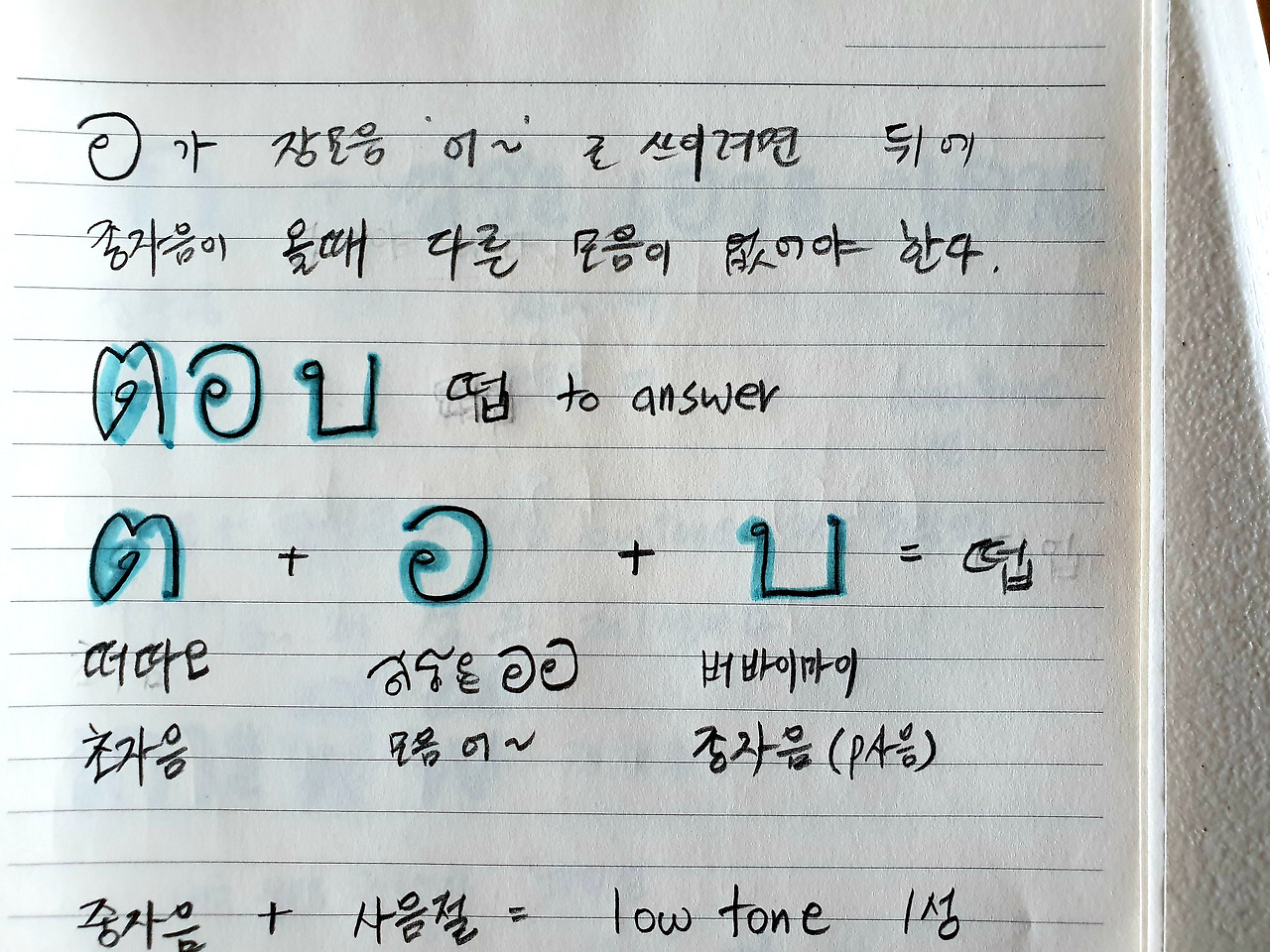 그냥 장모음으로 되는 게 아니다. 어앙 뒤에 다른 모음 없이 그대로 자음이 와야 이 어앙이 장모음 어로 쓰이게 되는 것이다. 대답하다의 떱을 보자. 떠따오 에 어앙에 버바이마이가 오니까 어앙이 장모음 어~ 로 변한다. 아하. 그러면서 버바이마이가 칵 막히는 사음이니까 장모음일지라도 사음 엔딩이면 제 1성이니까 Low Tone 다. 아래서 시작해서 더욱 아래로 떱! 대답하다.