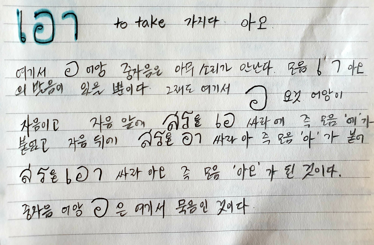 중자음 어앙은 아무 소리 안난다. 즉 묵음이다. 싸라아오 모음 아오. 자음 어앙은 그냥 아무 소리 없이 모음 아오로만 발음된다. 중자음 어앙은 이렇게 묵음이 되는 것이다.