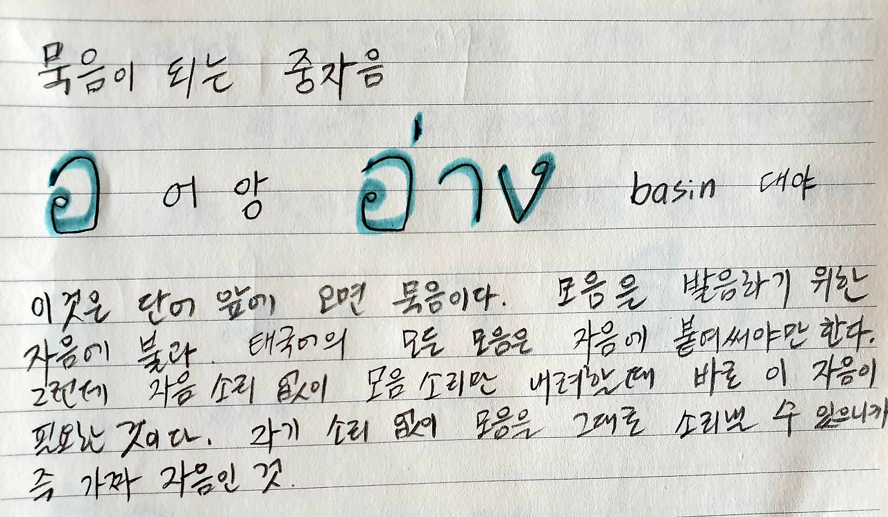 중자음 어앙이다. 어앙은 단어 앞에 오면 묵음이다. 모음을 발음하기 위한 자음에 불과. 태국어 모음은 자음에 붙여써야만 하니까. 자음 소리 없이 모음 소리만 내려할 때 바로 이 자음을 쓴다. 자기 소리없이 모음을 그대로 소리낼 수 있으니까. 즉 어앙은 가짜 자음이다.