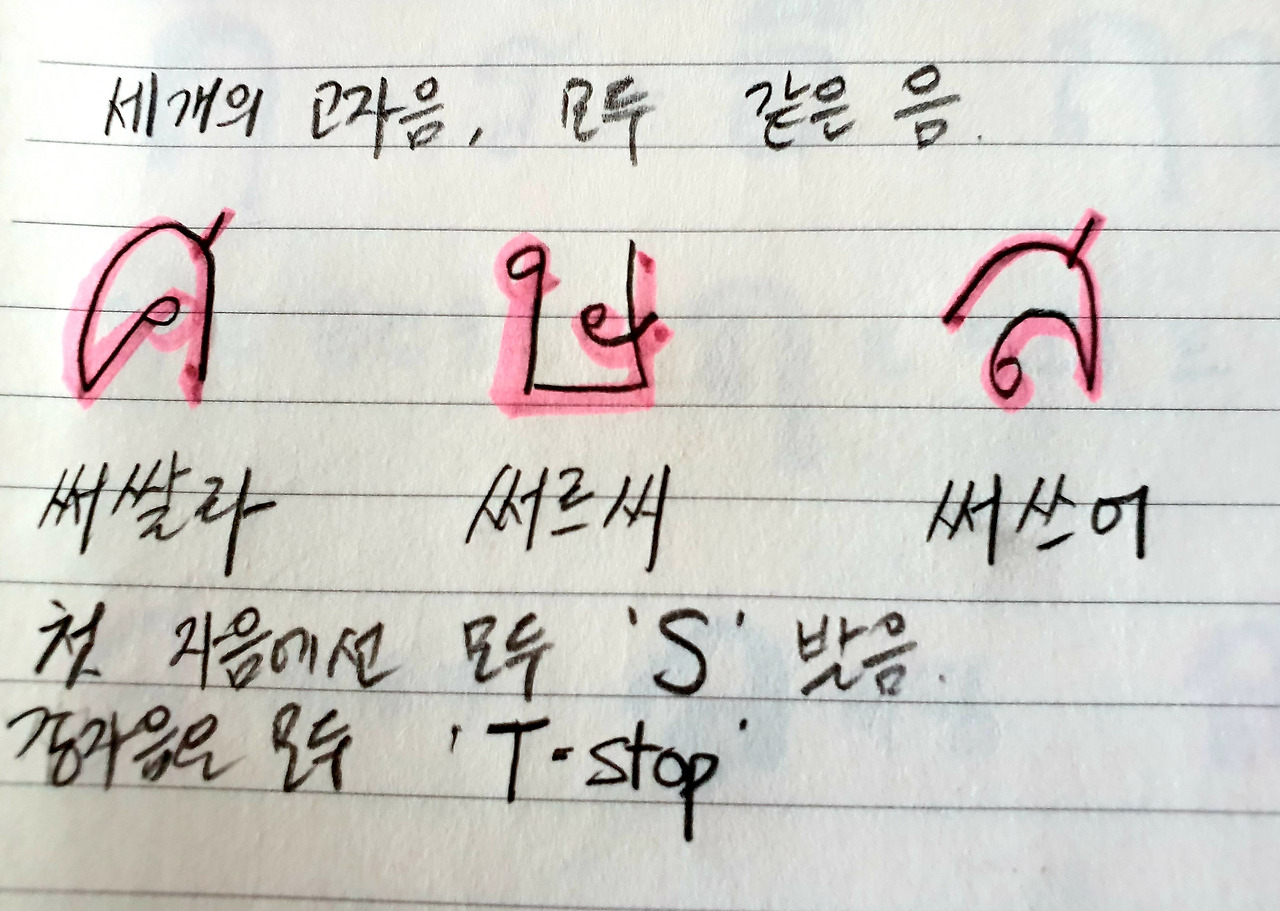 그렇다. 오늘 공부하는 써쌀라 써르씨 써쓰어 모두 첫 자음에선 시옷 즉 S 발음이 난다. 요것이 종자음으로 가게되면 모두 T- Stop. 즉 칵 목이 막히며 끝나버리는 사음 엔딩인 것이다. 사음이냐 생음이냐는 성조를 결정하는 데 중요하게 작용하기 때문에 꼭 기억해야 한다.