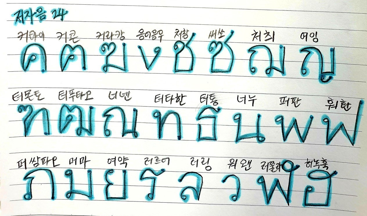 하핫 시험이 임박한 것도 아니고 누가 태국 가서 태국어 테스트를 하는 것도 아니고 나 혼자 좋아 스스로 해보는 것 괜히 압박받을 필요 없다. 모를 것 같으면 다시 보아가면서 쉬엄쉬엄 익혀지는 데까지만 태국어를 하리라. 그러니 고자음이 11개이며 커카이 커쿠웟 처칭 터탄 터퉁 퍼픙 훠화 써쌀라 써르씨 써쓰어 허힙 이라는 것 내가 열 번이고 백번이고 다시 보며 간들 누가 무어라 하랴! 하핫 요 거이 이 나이에만 가질 수 있는 매력이니라. 엣 헴