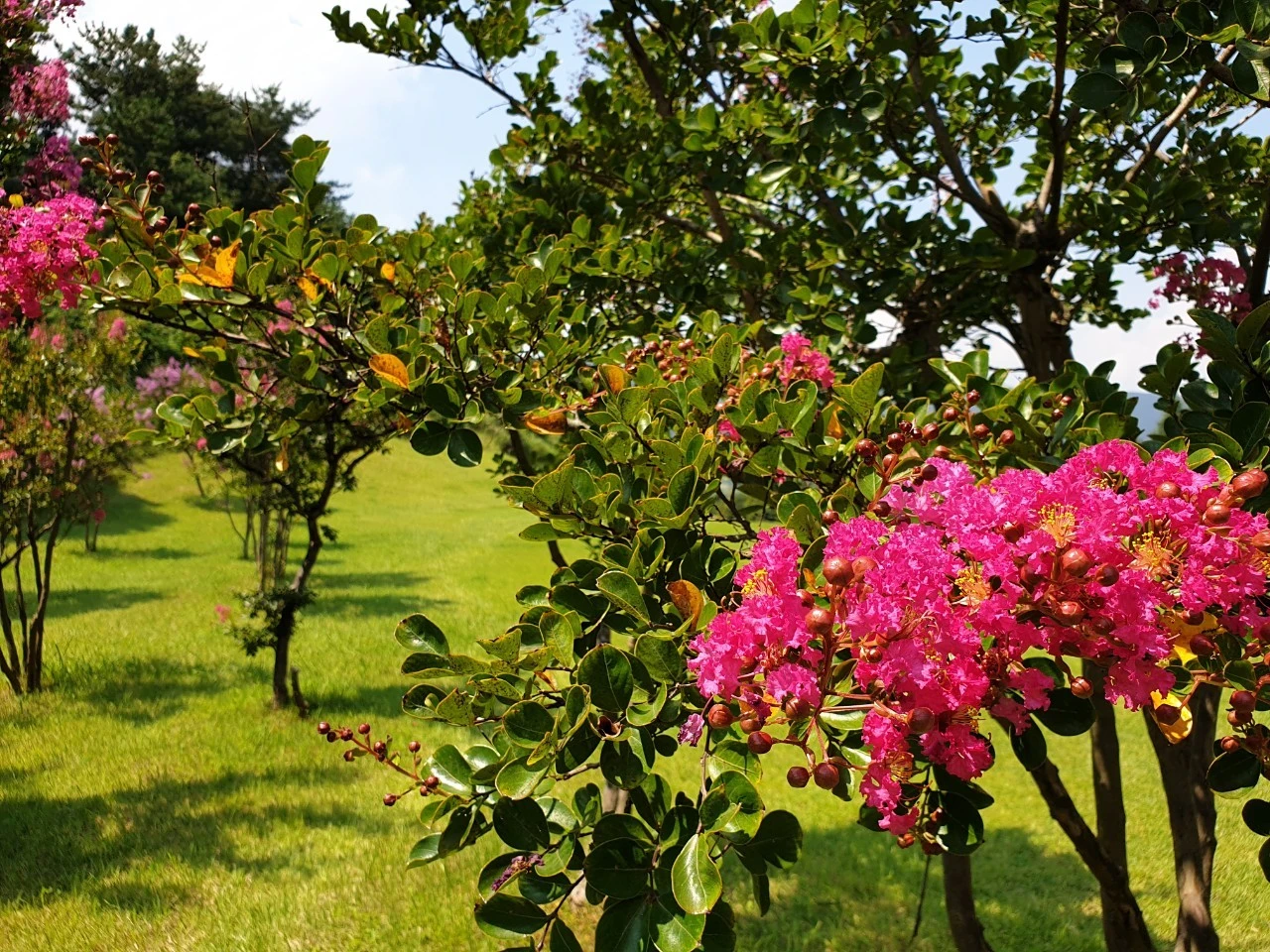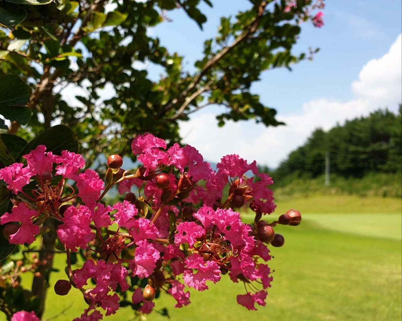 서코스 2번 홀 너무 예쁜 꽃. 한 번에 피고 지는 것이 아니라 여러 날에 걸쳐 번갈아 피고 져서 백일동안 꽃이 펴 있는 것처럼 보여 백일홍이라고 불렀는데 백일홍 백일홍 하던 게 쉽게 발음하다 보니 배롱으로 되었다는 배롱나무. 백일홍이라는 국화과의 한해살이풀과는 확실히 다른 것이다.