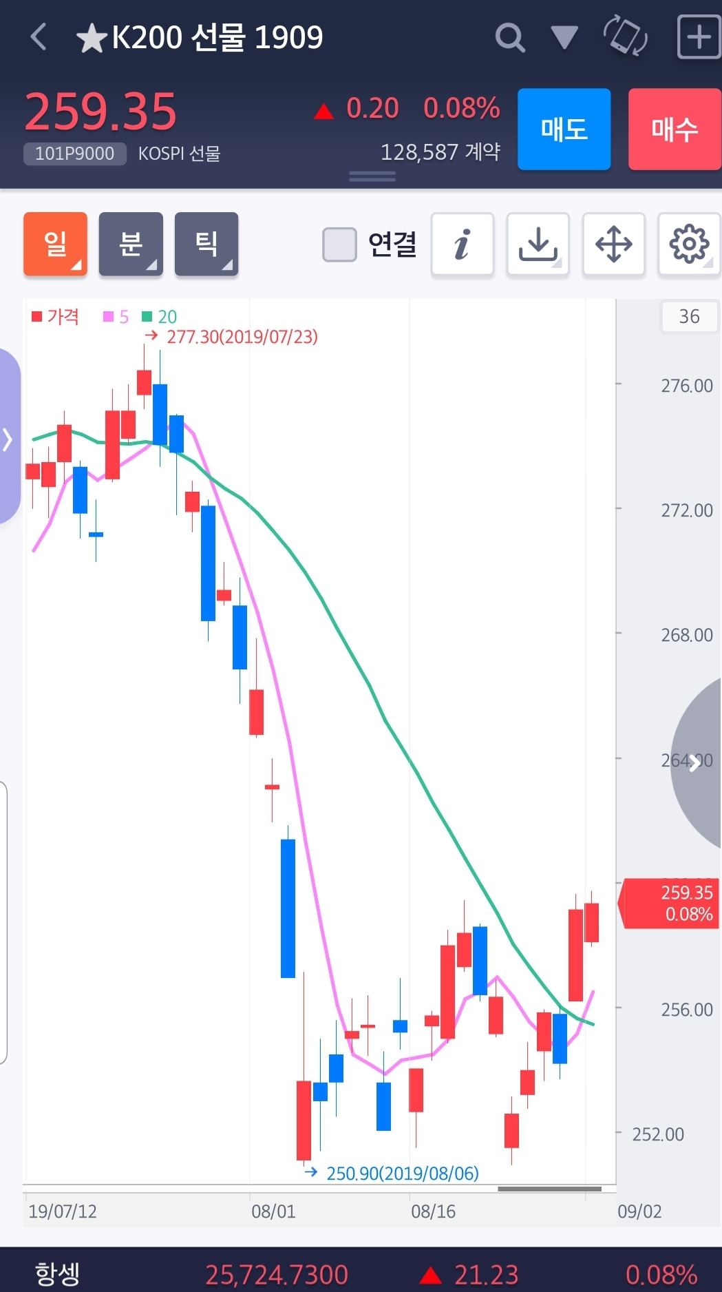 드디어 드디어 5일선이 20일선을 빵 뚫고 올라갔다. 이 순간을 얼마나 기다렸던가. 매도하고 좀 수익 나자마자 나는 일단 수익을 챙겼다. 그러고 나서 한참을 더 내려갔다. 그야말로 신나게 떨어졌다. 그러나 이미 난 이익실현한 상태. 괜히 정리했나 봐 안타까워는 했지만 그렇다고 5일선이 20일선 아래 있는데 너무 많이 내렸다고 덜컥 매수해버리는 우를 범하지는 않았다.