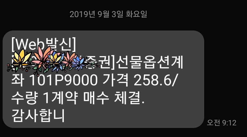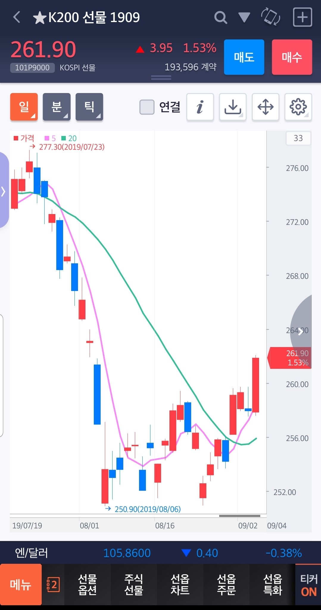 2019년 9월 2일 일봉에선 5일선이 20일선을 위로 뚫고 올라갔다. 그러므로 난 9월 3일 시초가에 동시호가로 매수에 가담해야만 했다. 그런데 전날 밤 캐나다에서 온 남동생과 엄마와 함께 아버지를 추억하는 술파티를 벌이느라 그다음 날인 9월 3일 아침에 깜빡하는 우를 범한 것이다. 아차! 하는 순간 시계를 보니 앗 이미 9시가 넘었다. 하이고~ 이럴 수가. 그런데 억울하게도 시초가가 제일 낮은 상태로 빠바바 방 올라가고 있지 아니한가. 잠시 갈등. 시초가와 꼭같은 값 258.15에 넣어두고 체결되기를 기다리느냐 아니면 그냥 지금 값에 무조건 매수해야 할까. 어쩜 이렇게 무관심이라니. 그래도 원칙이라고 정해놓은 것 난 지켜야 한다. 무조건 늦었지만 서둘러 매수를 한다. 가격 불문. 그렇게 체결된 것이 258.60 정신만 차렸다면 258.15에 체결될 수 있었는데 바보. 차라리 시초가 가격과 똑같은 값에 넣어두었다면 지금은 막 올라갔지만 끝에는 내려갔기에 얼마든지 시초가에 다시 체결될 수 있었다. 그러나 그대로 올라버릴 수도 있으므로 원칙대로 무조건 일단 매수를 해 놓은 것에 짝짝짝 박수를 보내자.