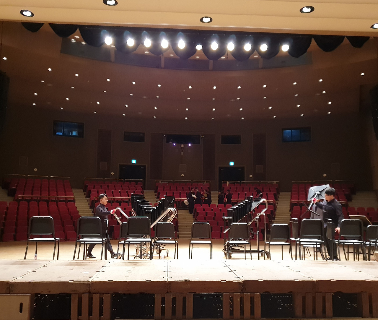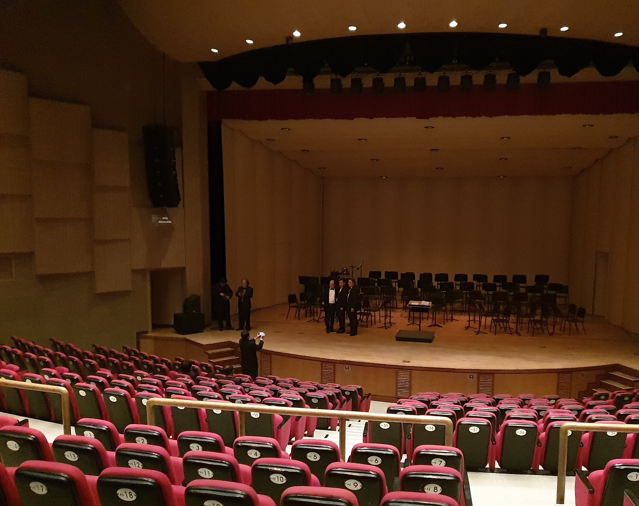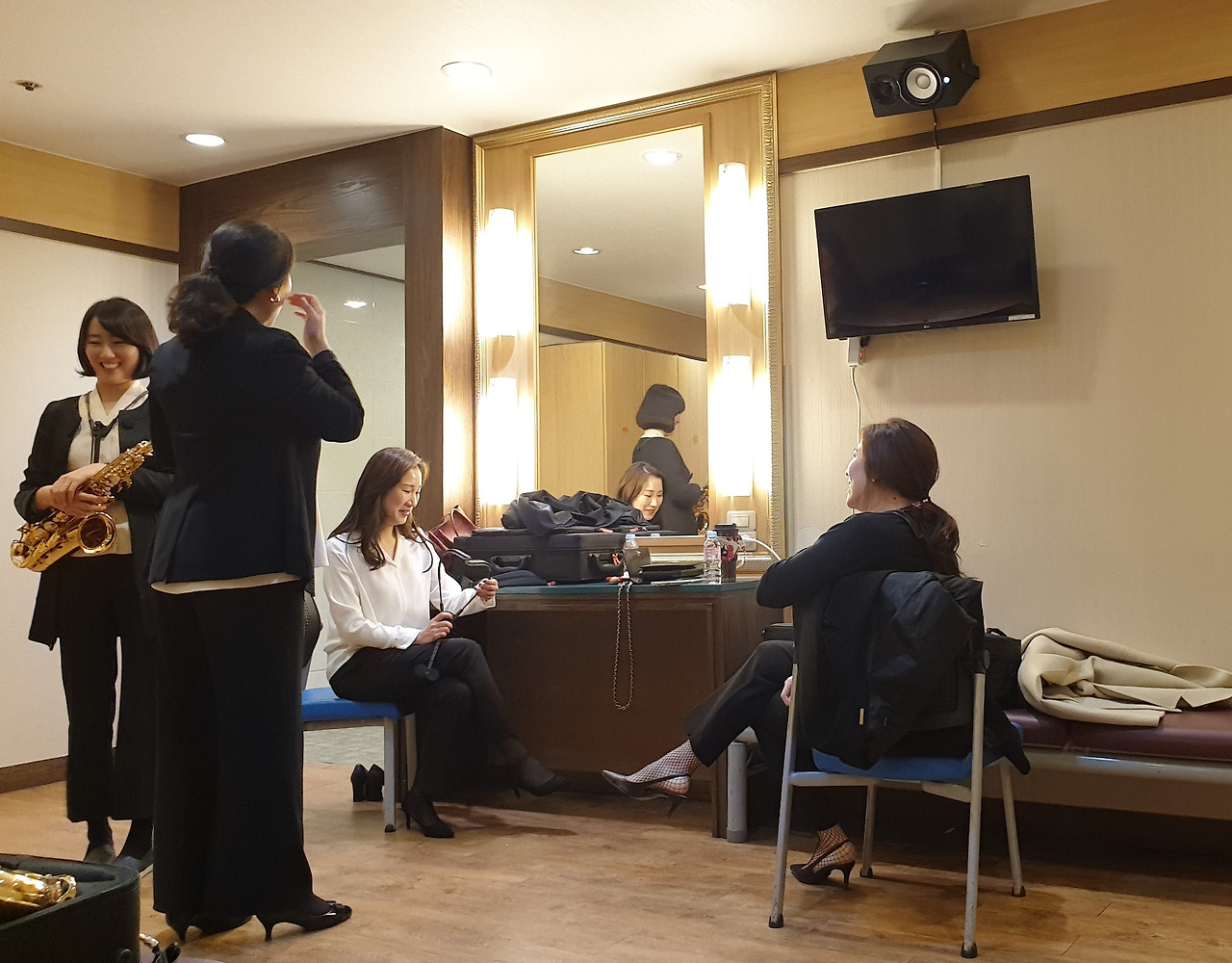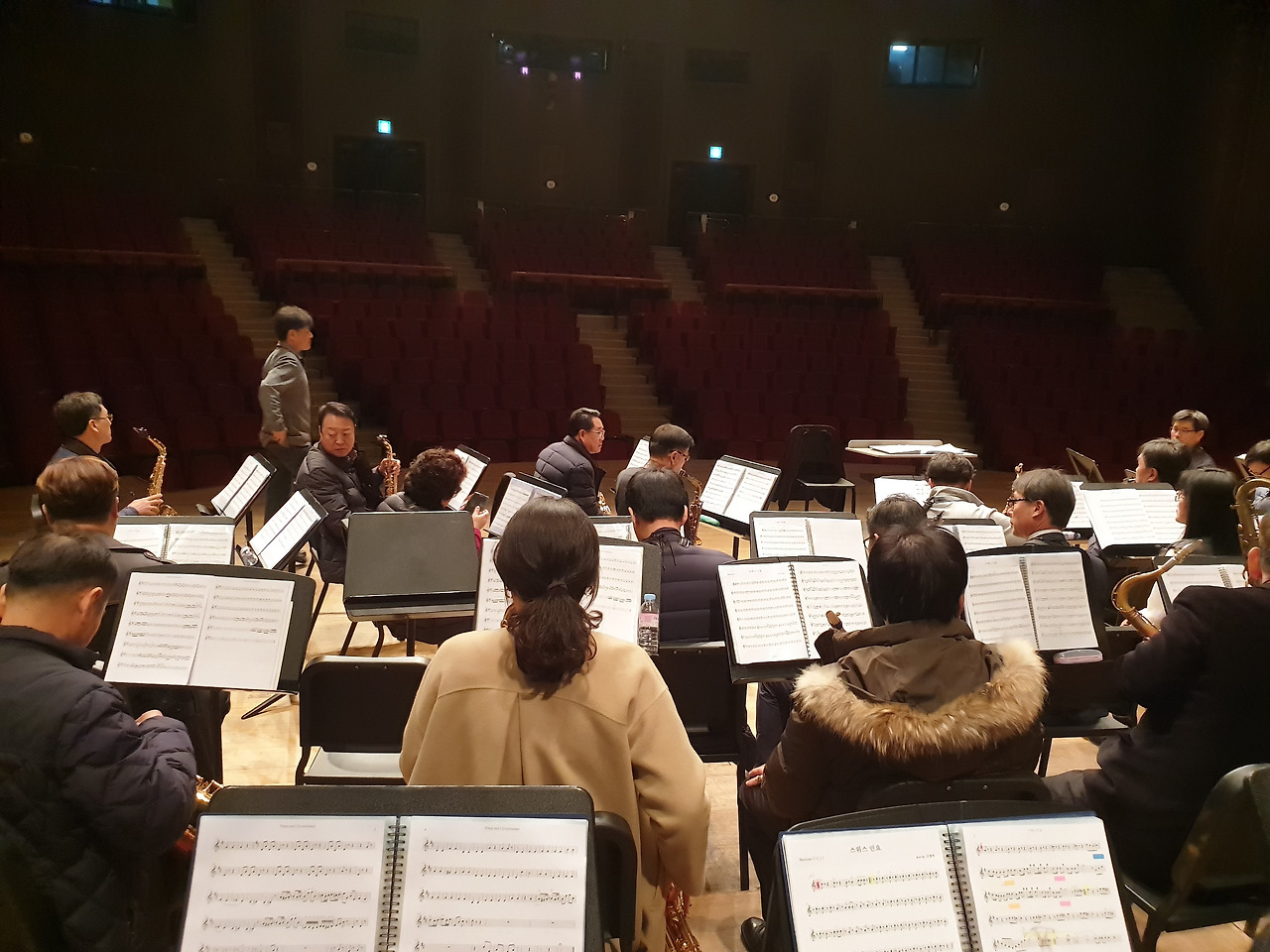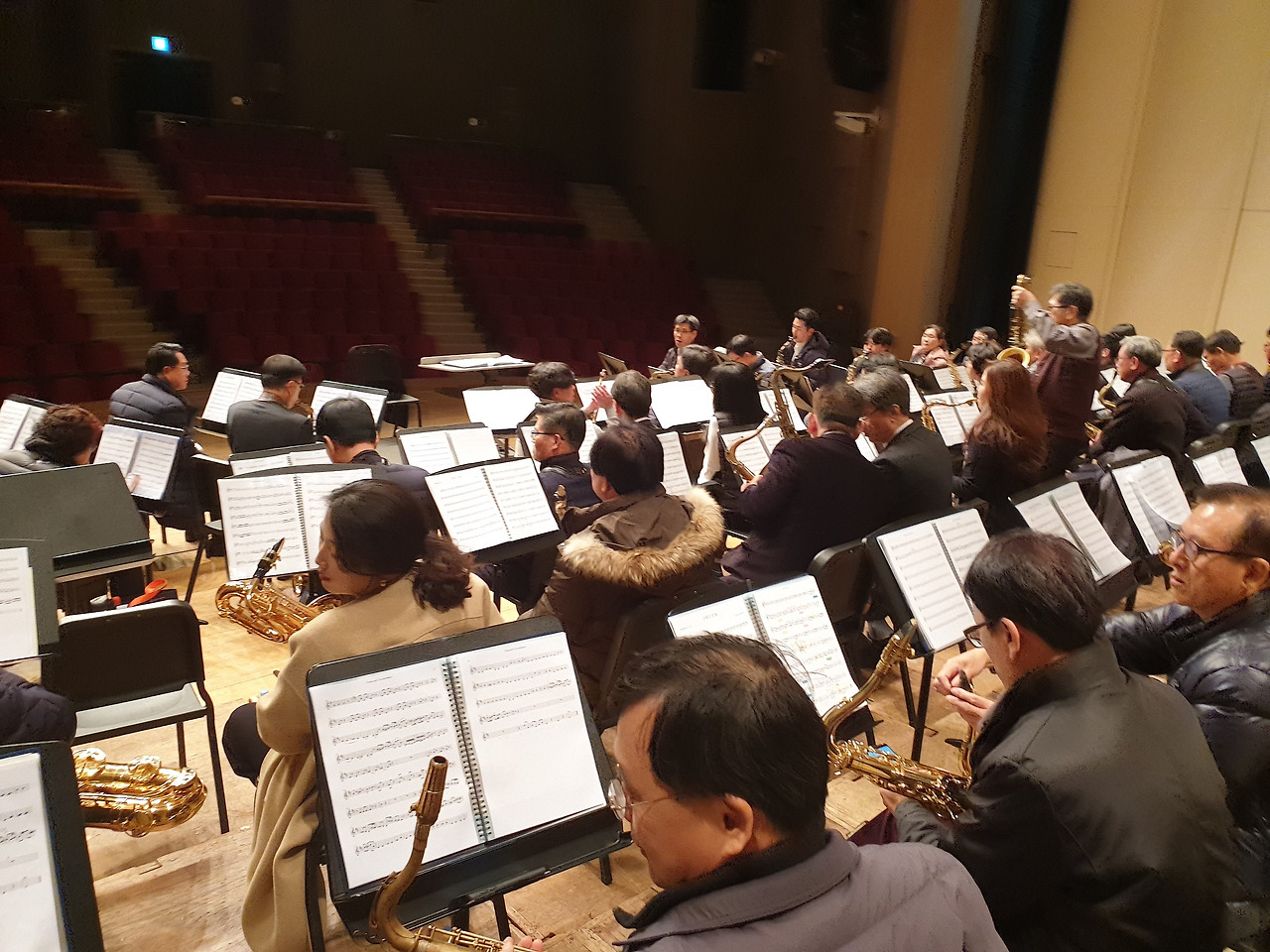 다시 문화예술회관으로 와 정식 연주 때까지 잠시 자유시간이다. 텅 빈 객석에서 이리저리 사진 촬영도 하고 아니면 그냥 분장실에 늘어져있기도 하고 또는 연습을 하기도 한다. 그러나 색소폰 소리가 워낙 커서 모두 함께 연습을 하면 그건 또 문제다. 살살 조금씩 불어 볼 뿐이다. 손님들이 몰려오기 시작한다. 우린 분장실로 들어가 조용히 대기한다.
