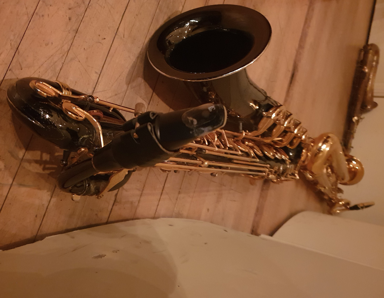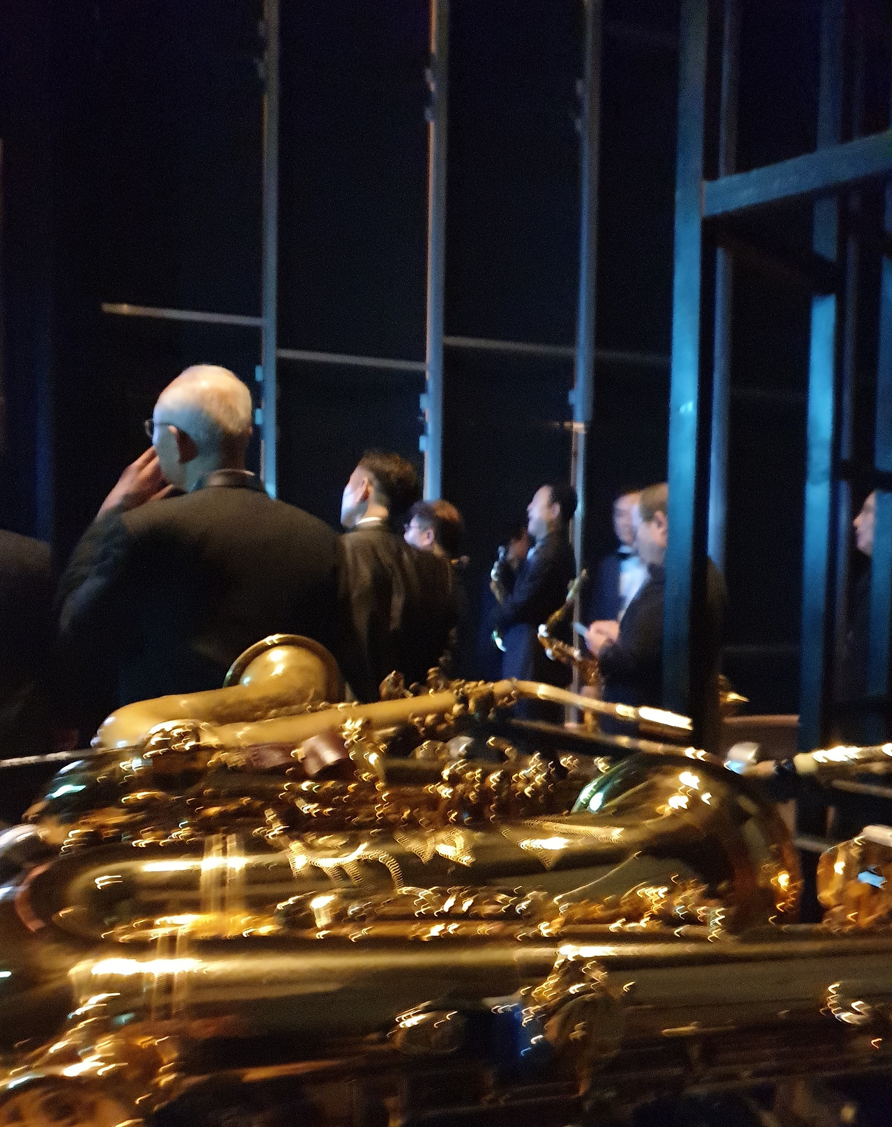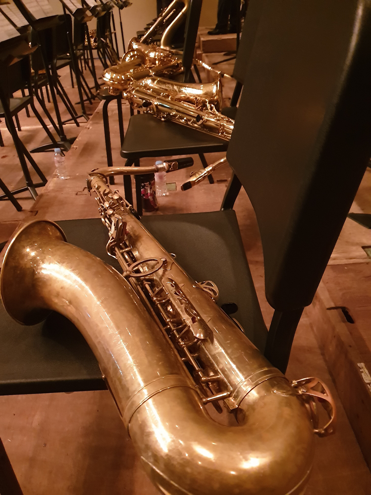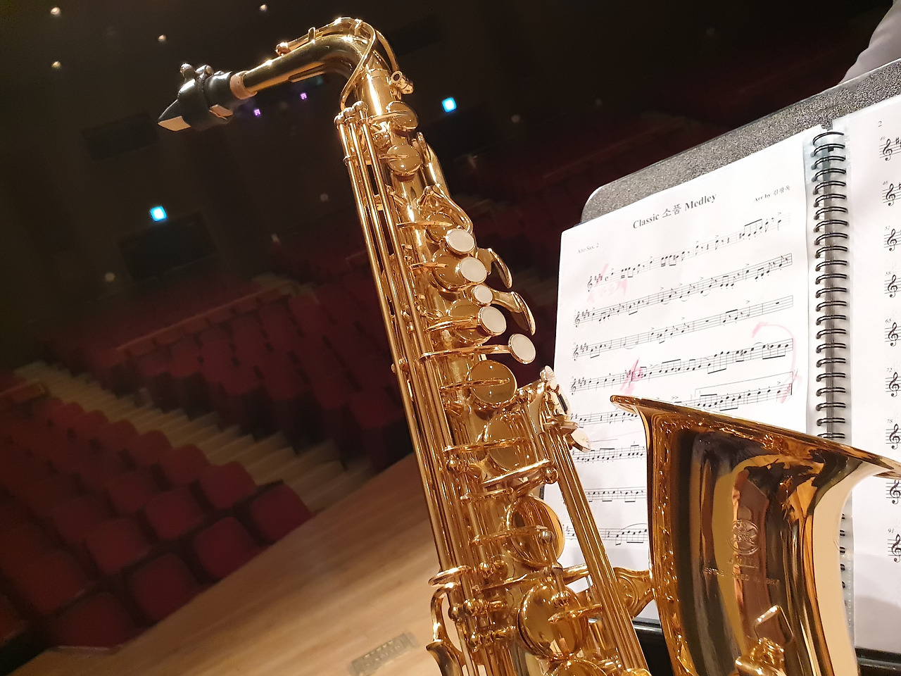 무대 뒤 대기 시간. 색소폰이라는 악기가 매우 무겁기에 오래 들고 서 있으면 지친다. 그래도 대개는 몸에 달고 있지만 혹자는 이렇게 무대 뒤에 가득한 조명대 위에 놓고 우리 순서가 되기를 기다린다. 살짝 무대 뒤에서 들여다보니 제대로 복장을 갖춰 입고 그 불타는 청춘 난타 예술단이 둥둥 두둥둥 신명 나게 북을 두들기며 춤을 추고 있다. 하하 재밌다. 그러나 다시 긴장해야 한다. 저 공연이 끝나면 이젠 우리의 시간. 마지막 연주가 남아있다. 집중하여 조심조심.