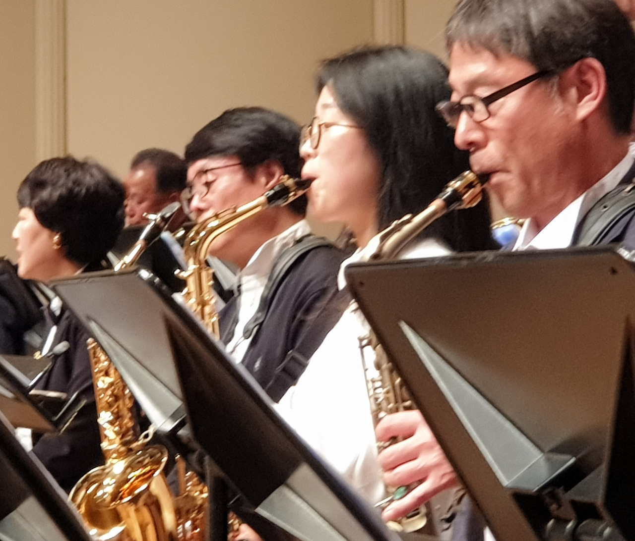 각 파트에 지정된 멤버들. 남편은 테너 색소폰이고 나는 알토 색소폰이기에 함께 오지만 일단 연습이 시작되면 우리는 아주 멀리 떨어져 있어 함께 있는 줄도 모를 정도다. 그는 트롬본 파트를 맡아 거의 맨 뒤에 있고 알토 파트를 맡은 나는 맨 앞자리에 있기 때문이다. 그래서 연주장 또는 연습장에 오면 나의 파트너는 잠시 바뀐다. 함께 알토 파트를 연주하는 나의 새 파트너는 나를 참 잘 챙겨준다. 예를 들어 물이라든가, 악보대를 접는 것이라든가, 빨간 펜을 빌려준다든가, 연필을 가져다준다든가, 악보를 정리해준다든가 푸하하하 남편이 해주는 온갖 도움을 연습장에서는 새 파트너가 해준다. 그래서 색소폰에 가는 그 잠깐 나는 체인징 파트너가 되는 것이다. 음하하하 이 또한 매력적 아니겠는가.