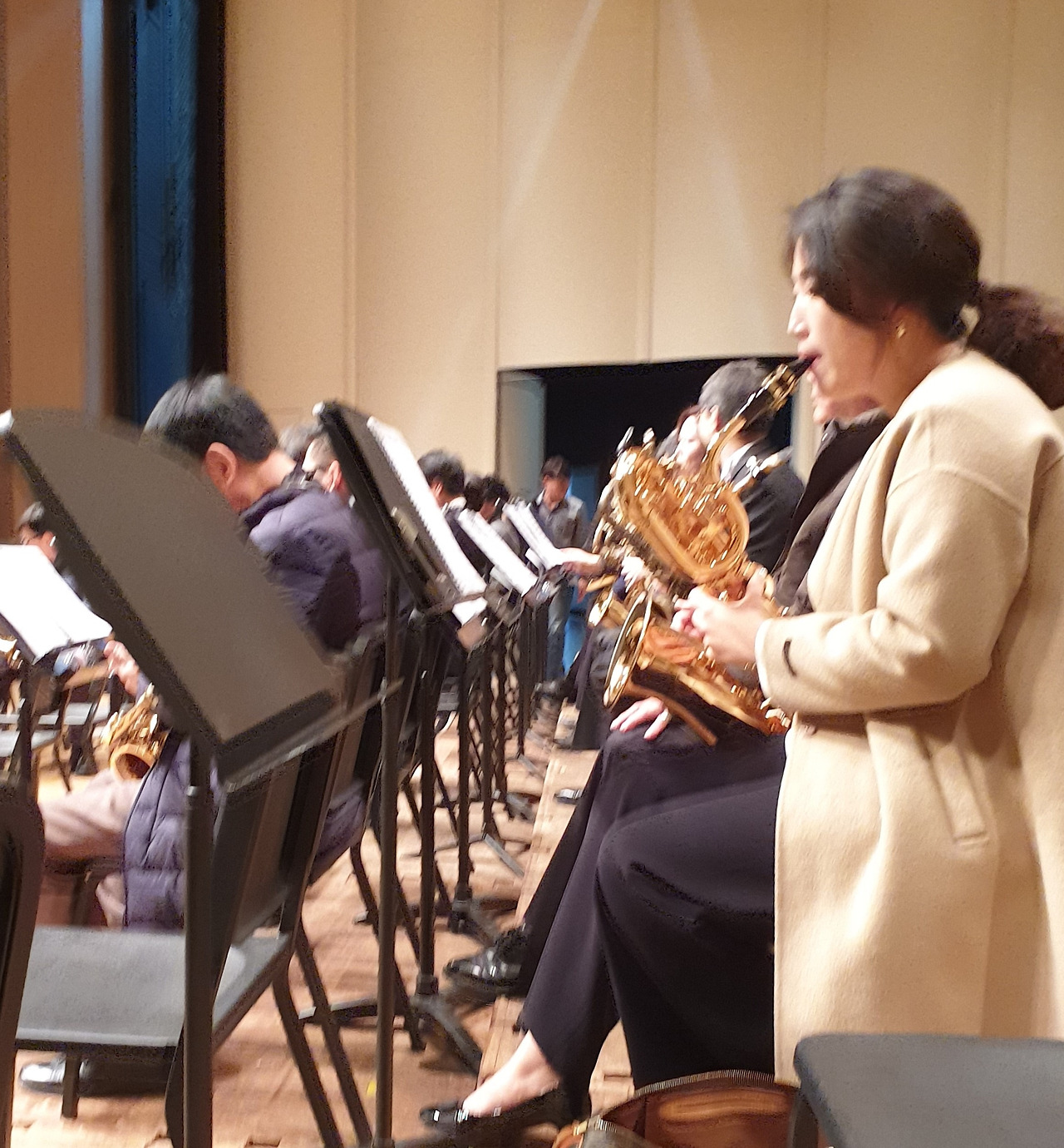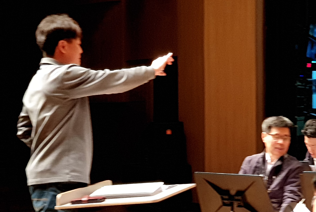 두시반부터 정식 리허설이다. 실제 연주와 꼭 같이 연주를 하는 것이다. 복장은 아직 자유 상태. 그런데 이런 곳에 꼭 지각하는 사람이 있다. 지휘자는 안절부절. 정식 리허설은 모든 사람이 와야만 시작할 수 있기에 전화로 연락을 하고 바쁘다. 왔대요 왔대. 휴우. 자, 솔로를 위한 마이크가 마련되고 지정된 자리에 모두 앉는다. 빵~ 프로그램대로 실전과 꼭 같이 하는 최종 리허설이다. 난 알토 파트. 빰 빠바 바바바 빰 바바 바바바 아주 적게 지휘자 손끝 따라 뱃속에서부터 호흡으로 빠앙 불어내며 우리의 첫 곡을 시작한다. 오랜 연습기간 줄기차게 이어졌던 지휘자의 세세한 지시가 또 떨어지고 있다. 우리는 새카맣게 또는 새빨갛게 적혀있는 악보 속 지시를 다시 한번 체크하며 오늘의 연주를 준비한다.
