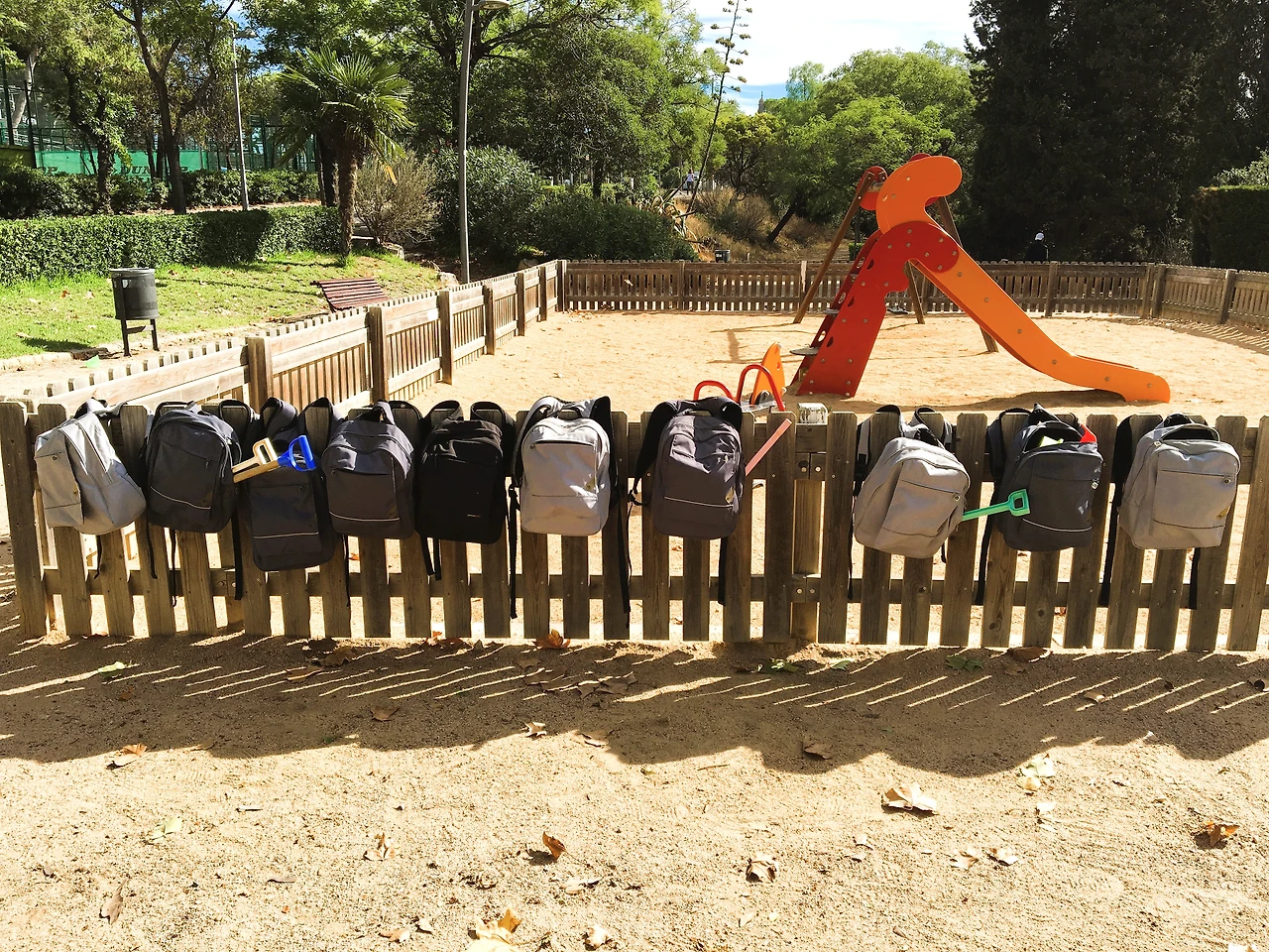 몬주익 언덕을 올라가는 중에 본 아이들의 책가방, 아이들은 가방을 걸어놓고 선생님을 따라 근처로 야외 수업을 갔다.