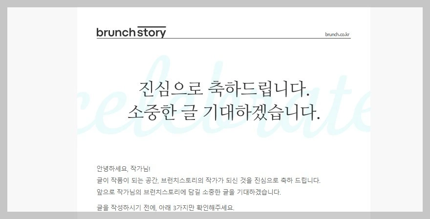 올봄 4월 14일에 브런치스토리에 가입하고, 브런치 작가가 되신 것을 진심으로 축하드린다는 메일을 4월 16일에 받고 정말 기뻤다.