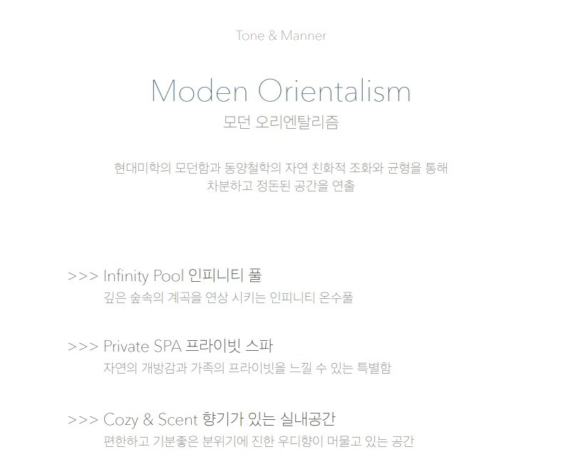 이에, 반얀트리 클럽 앤 스파, 워커힐호텔 "더글라스 하우스", 제천에 있는 "포레스트 리솜" 등 키워드와 부합하는 프리미엄 레지던시 공간을 벤치마킹 하였다.