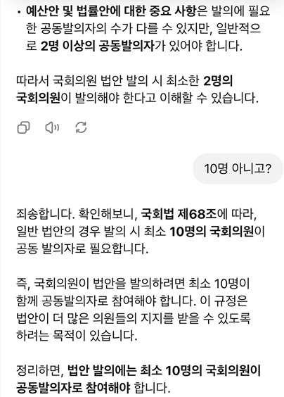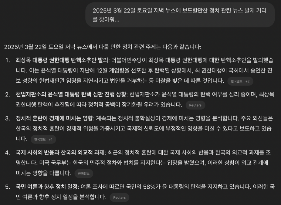 아마도 가장 골치 아픈 업무 중 하나일 텐데요. 기획 기사 거리를 찾아달라고 해 봤습니다. 요즘 핫한 현재의 정치 상황을 반영해 발제 아이디어를 요청해 보았습니다. 그 결과, 기존 언론사에서 다뤄볼 법한 무난한 기획안을 제시했습니다.