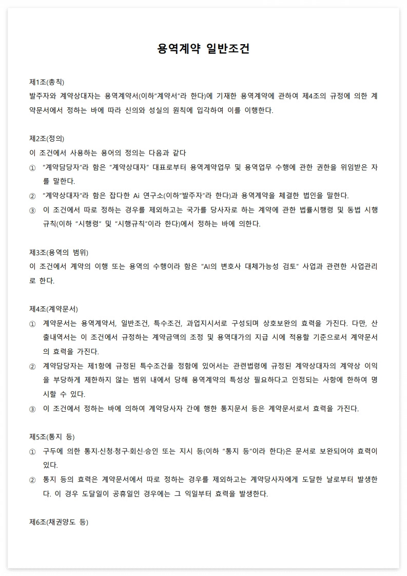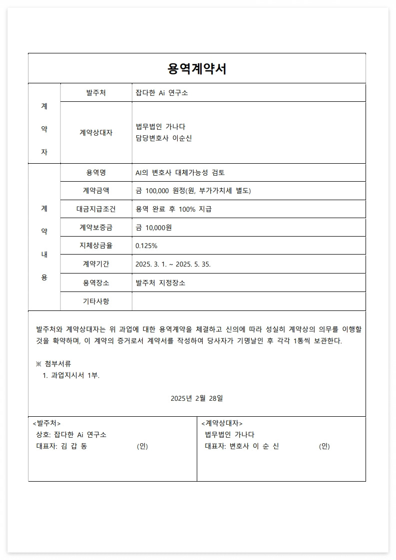 슈퍼로이어가 자문 업무는 얼마나 잘 해낼까요? 이번에도 잡다한 Ai 연구소와 법무법인 가나다 소속 이순신 변호사 간의 가상의 용역계약서를 만들어 실험해 보겠습니다. 서 변호사는 이 문서 곳곳에 일부러 수정이 필요한 오타나 오류를 숨겨놨습니다. 과연 얼마나 찾아낼 수 있을까요?